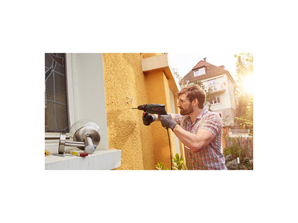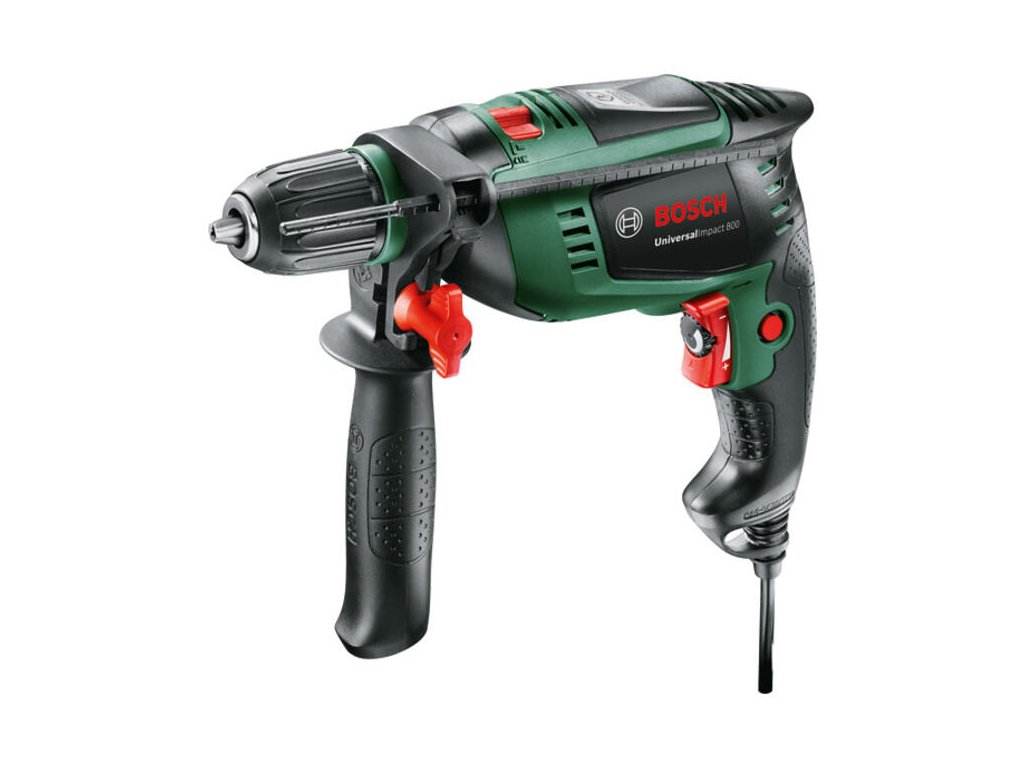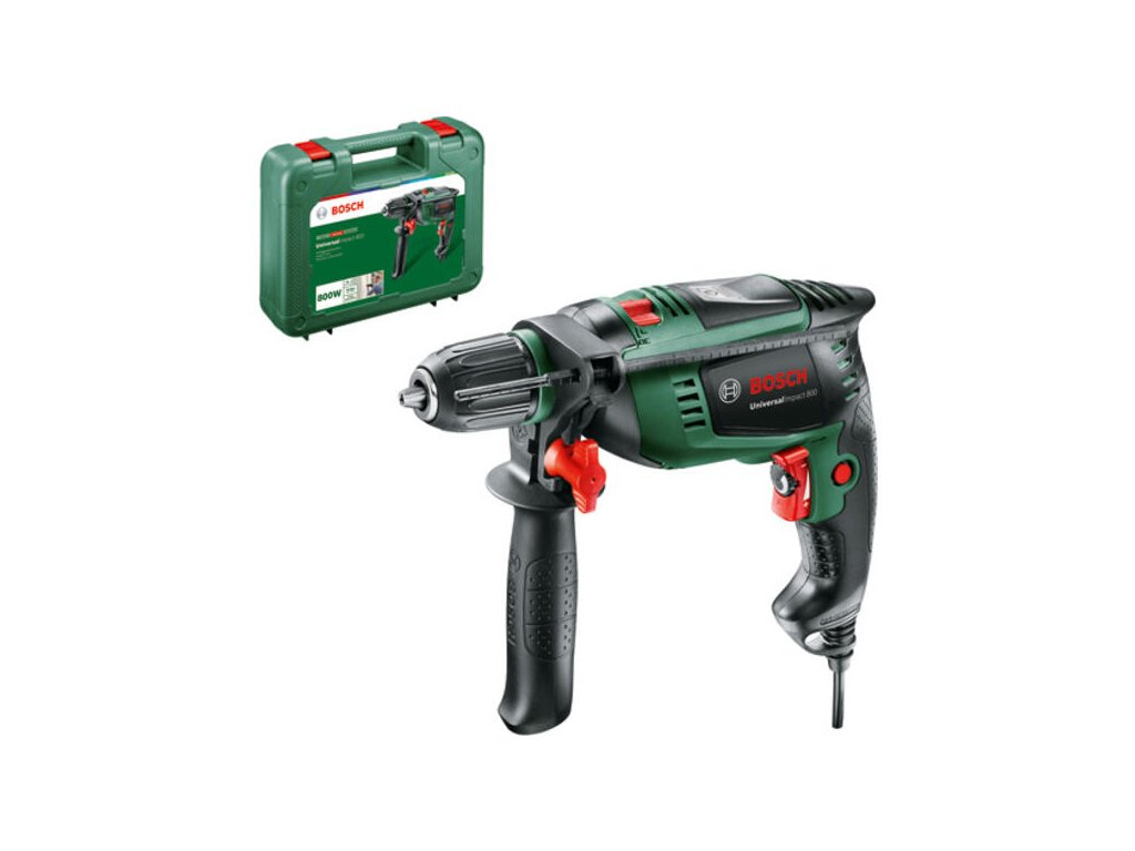 Príklepová vŕtačka UniversalImpact 800; Výkonná príklepová vŕtačka s funkciou KickBack Control na veľké projekty; Funkcia KickBack Control zvyšuje bezpečnosť; Jednoobjímkové rýchloupínacie skľučovadlo so systémom Autolock na rýchlu a pohodlnú výmenu vrtákov; Funkcie predvoľby otáčok Bosch Speed Preselection a konštantných otáčok Constant Speed na účinné vŕtanie; Vŕtanie bez námahy do muriva do 14 mm a dreva do 30 mm; Prídavná rukoväť (2.609.256.D93); Hĺbkový doraz (2.603.001.019); Kufor