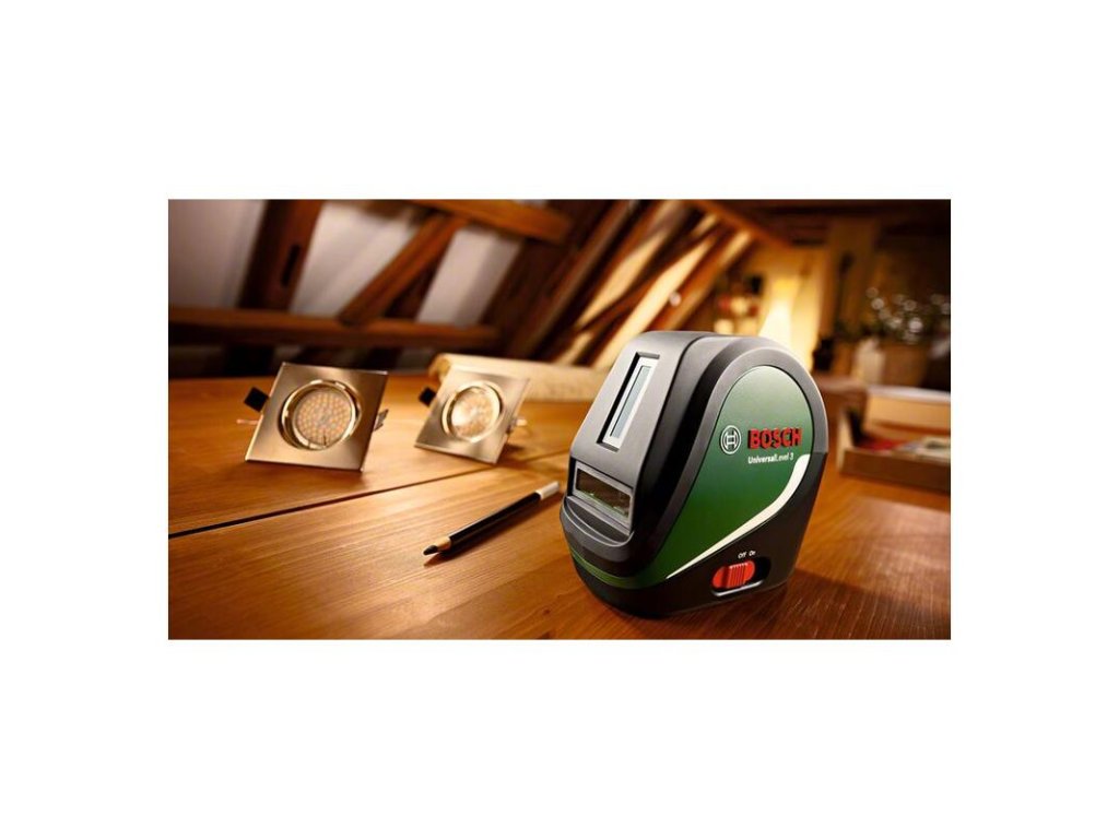 Krížový čiarový laser UniversalLevel 3; Perfektný na renovačné, dekoračné a údržbové práce; Projekcia laserového kríža s ďalšou vertikálnou líniou s uhlom 90° a kolmicou; Laserové body a línie sa automaticky zarovnávajú a sú priame vďaka samonivelačnej funkcii; Funkcia sklonu na prácu mimo samonivelačného rozsahu s diagonálnymi laserovými líniami; Vysokokvalitné, jasné laserové diódy s presnosťou ±0,5 mm/m na presné pracovné výsledky; Uhol apertúry 120° na dlhé laserové línie aj na krátke pracovné vzdialenosti; Náradie podporuje trvalú udržateľnosť, viac podrobností nájdete nižšie; 3× batéria 1,5 V LR6 (AA); Mäkký vak; V škatuli