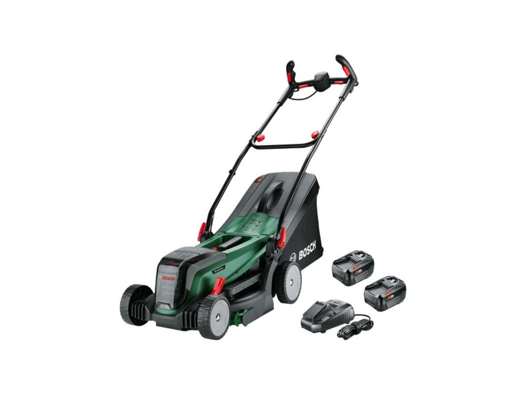 Akumulátorová kosačka UniversalRotak 2x18V-37-550; Výkonné kosenie a praktický zber trávy na stredne veľké až väčšie trávniky; Vysokovýkonné kosenie vďaka bezuhlíkovému motoru a elektronike 36 V (2× 18 V); Krásne trávniky s látkovým zberným košom na trávu a integrovaným indikátorom naplnenia; Ideálne na kosenie stredne veľkých až väčších trávnikov s dlhou alebo krátkou trávou; Mohutný výkon 36 V z 2 akumulátorov triedy 18 V; Technológia Syneon zaručuje optimálny výkon a maximálnu dobu prevádzky; Kompatibilné s akumulátorom Bosch 18V POWER FOR ALL; 2 akumulátory PBA 18V 4.0Ah; Nabíjačka AL 1830 CV; Kôš na trávu 40 l s indikátorom naplnenia; V škatuli