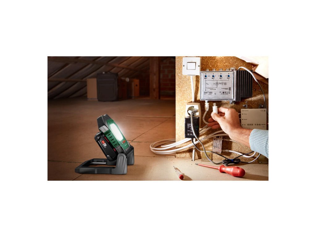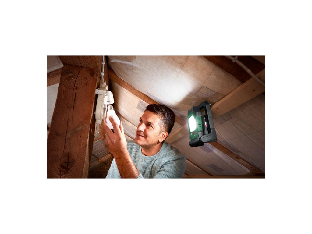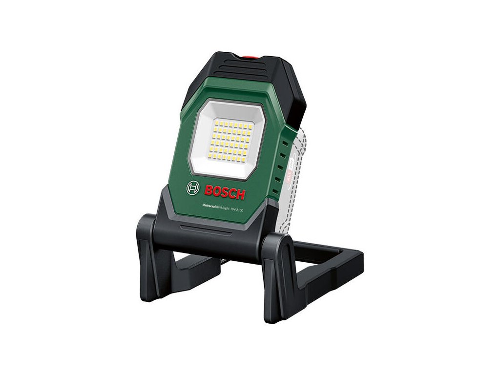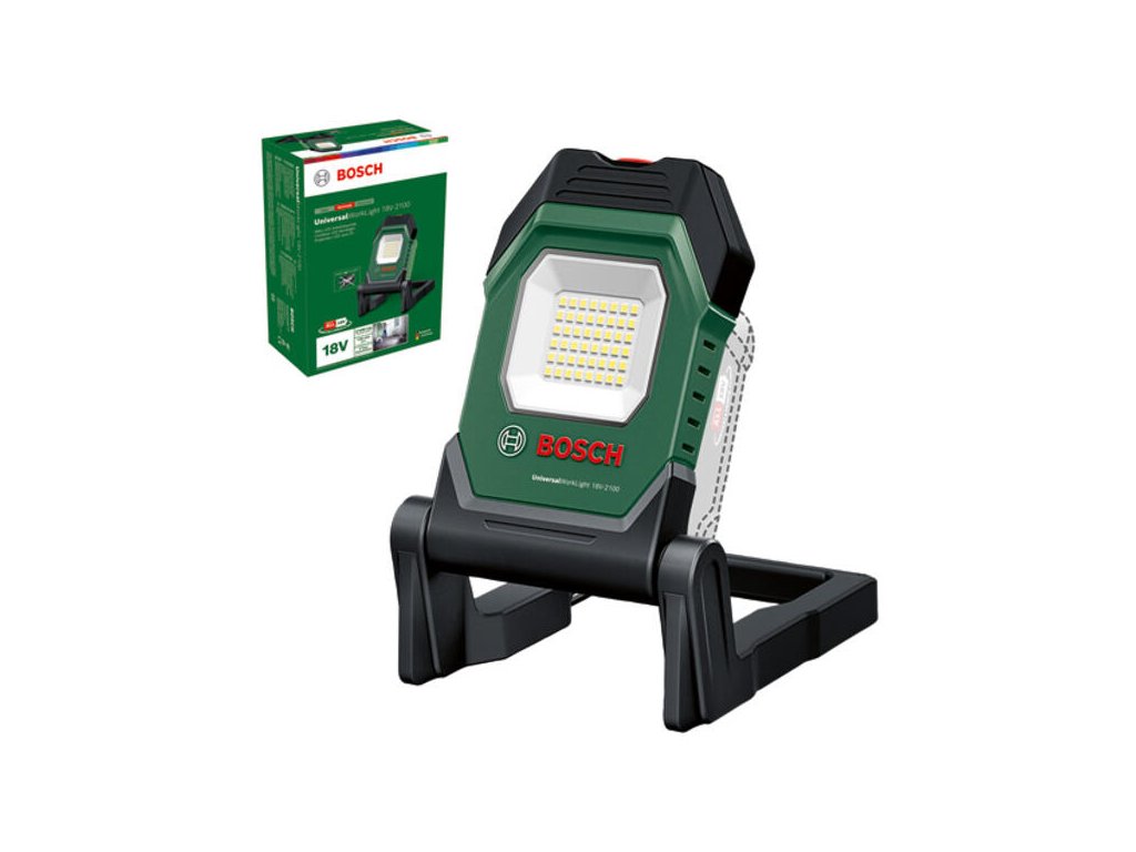 Akumulátorové LED pracovné svetlo UniversalWorkLight 18V-2100; Výkonné a flexibilné pracovné svetlo; 3 prispôsobiteľné nastavenia jasu s výstupným výkonom až 2 100 lúmenov ; Upevnenie pomocou háčika a magnetu umožňuje flexibilné umiestnenie; Otočná hlava svetla na všestrannú orientáciu; Pevná rukoväť a skladacia konštrukcia umožňujú ľahké prenášanie a uskladnenie; Kompatibilné s akumulátorom Bosch 18V POWER FOR ALL; V škatuli