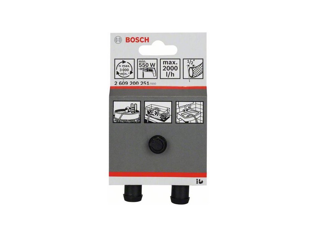 Vodné čerpadlo s nárazuvzdorným plastovým telom umožňuje praktické a univerzálne čerpanie. Samonasávacie samochladiace čerpadlo má maximálny výtlak 1500 až 2500 l/hod riadený skľučovadlom vŕtačky. Čerpadlo je kompatibilné s vŕtačkami s minimálnym nominálnym výkonom 450 W a poruchovými ističmi. Pred použitím si treba pozrieť používateľskú príručku vŕtačky a bezpečnostné pokyny. Horľavé kvapaliny nie sú pre toto čerpadlo vhodné. Vodné čerpadlá 2.609.200.251 a 2.609.200.252 sú určené na použitie s držiakom vodného čerpadla 2.609.200.253