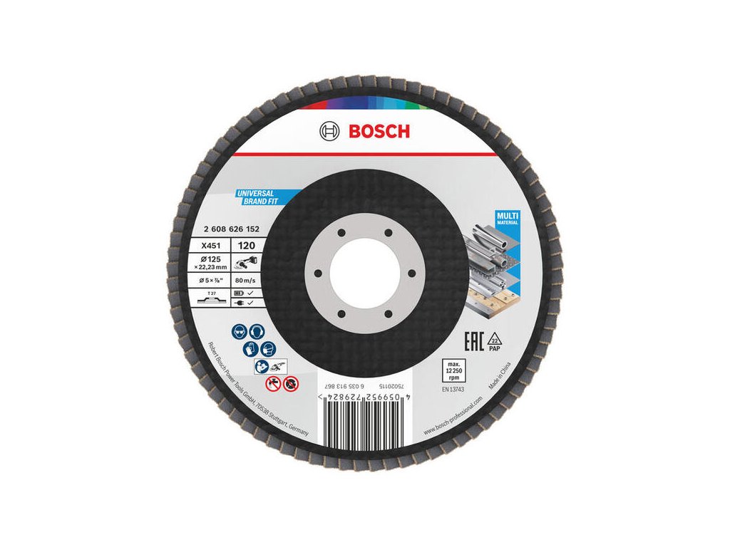Pre väčšie uhlové brúsky (125 mm) je určený lamelový kotúč Bosch X451 so zrnitosťou 120. Je ideálny na finálne brúsenie a leštenie nerezovej ocele, hliníka a dreva. Rovný tvar T27 uľahčuje prácu na veľkých plochách.