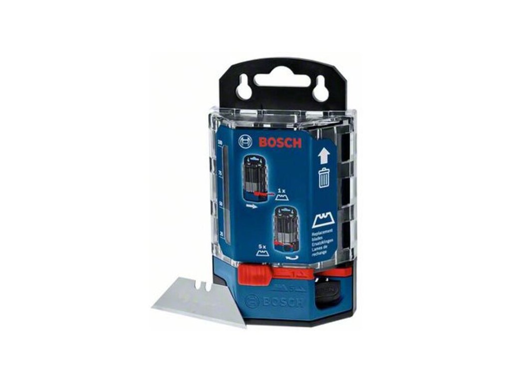 Čepeľ noža Zásobník na čepele, 50 ks, Zásobník na čepele Bosch Professional obsahuje 50 náhradných čepelí, ktoré sú kompatibilné so všetkými štandardnými úžitkovými nožmi Bosch Professional. Tieto vysokokvalitné čepele s dlhou životnosťou sú vyrobené z odolnej ocele S2 CVM a zaručujú čisté a presné rezanie. Kompaktný, dômyselne navrhnutý zásobník má výsuvný mechanizmus, ktorý môže naraz vydávať buď jednu čepeľ, alebo päť čepelí. Použité čepele možno bezpečne zlikvidovať vložením do hornej časti zásobníka. Hang Tag