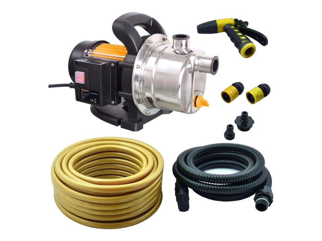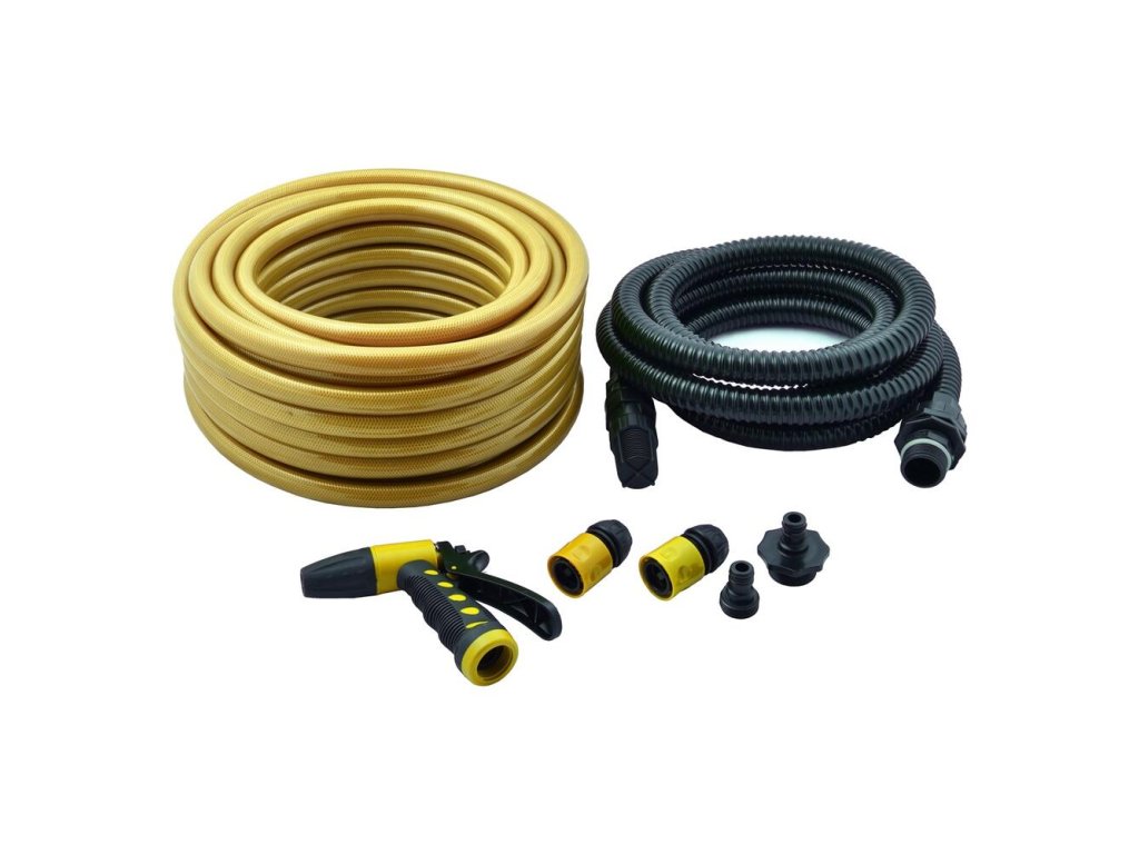 Kvalitné príslušenstvo zahŕňa 4 m saciu hadicu, 20 m záhradnú hadicu, 2x rýchlospojku, spojku čerpadlo - hadica, postrekovač