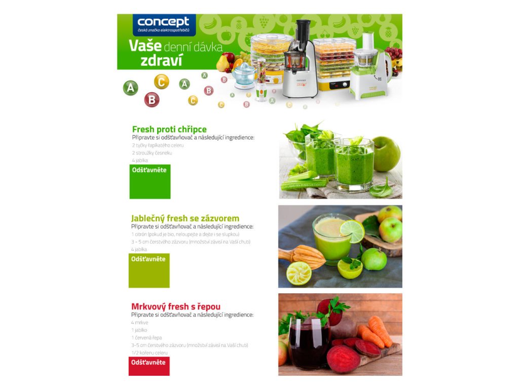 Nová aplikácia Concept Varenie je prehľadná a jednoduchá kuchárka, ktorá je vďaka mobilnému telefónu alebo tabletu stále s vami. Vyberte si medzi záložkami (dezerty, RAW, marmelády, šaláty, polievky, chuťovky atď.) a dajte sa do varenia. Už sa vám nestane, že nebudete vedieť čo uvariť na párty, rodinný obed alebo aké smoothie si vziať do práce. Slúži iež ako inšpirácia pre objavovanie nových chutí freshov a smoothies. Aplikáciu sťahujte tu pre iOS a tu pre Android