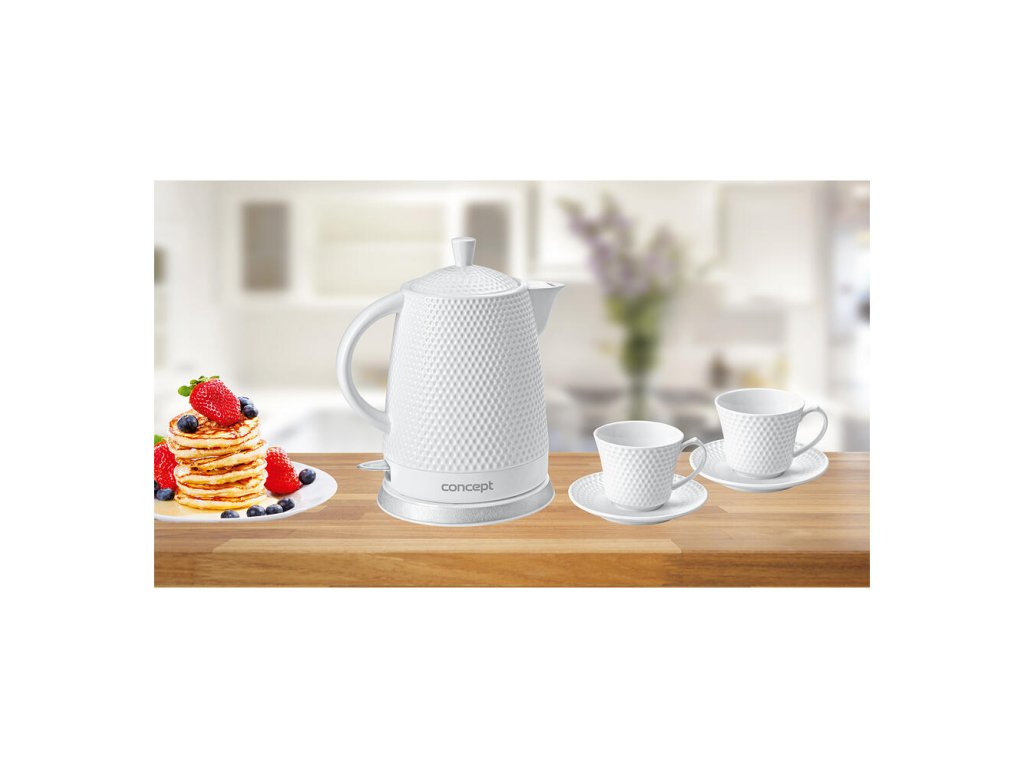 Keramická rýchlovarná kanvica RK0040 Concept s objemom 1,5 l s dvoma šálkami a podšálkami.