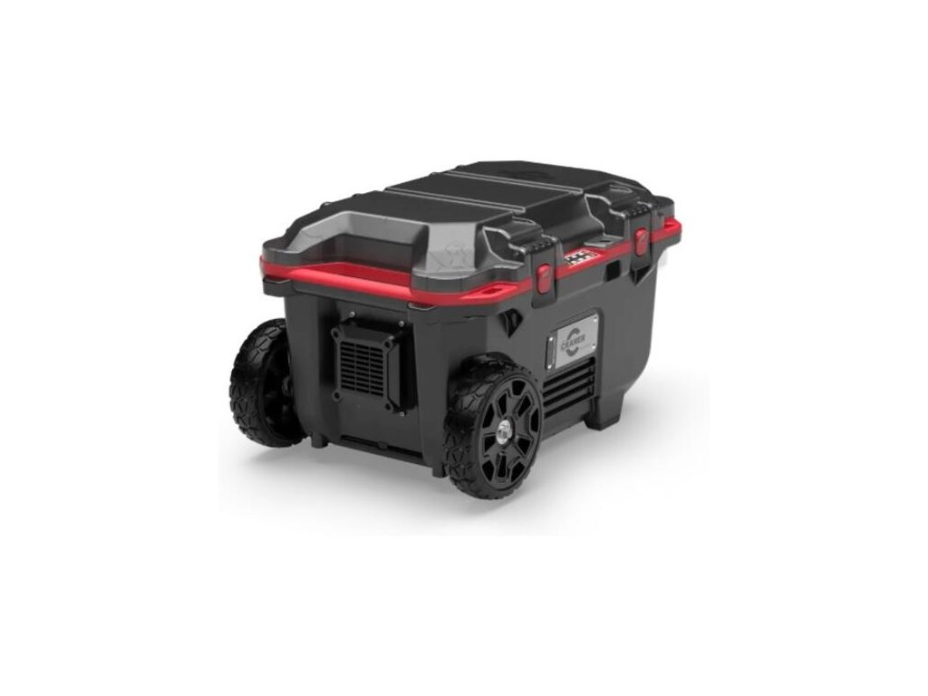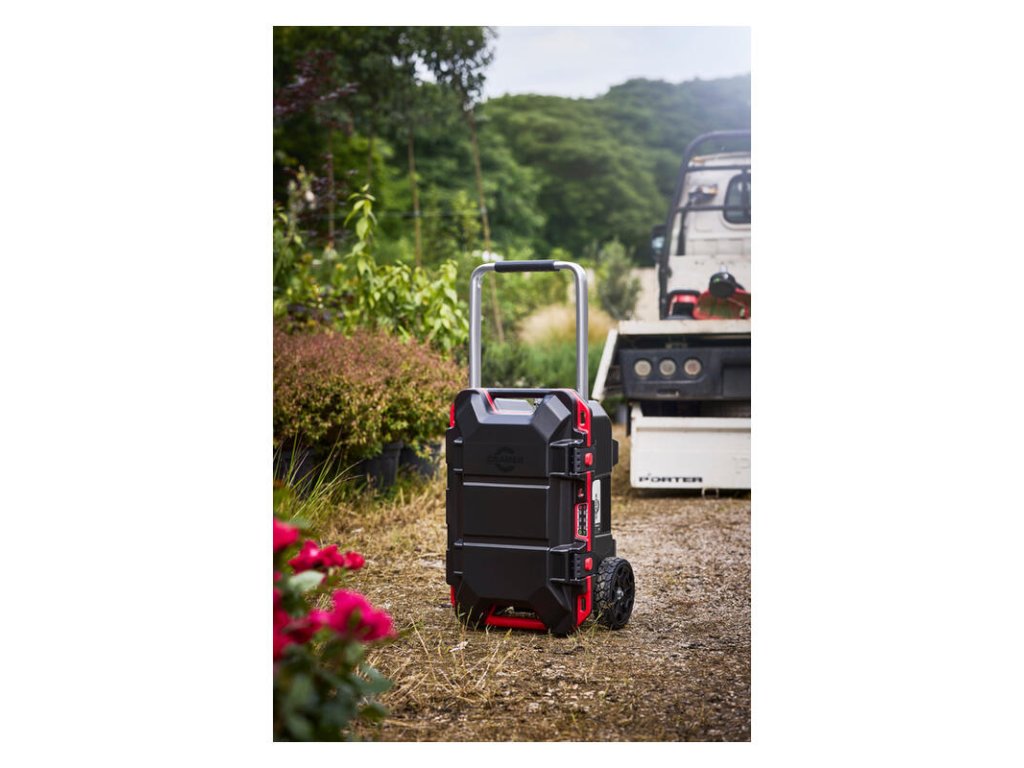 Všestranná mobilní stanice Caddy s velkými koly a výsuvnou rukojetí nabízí snadné řešení pro přepravu i správu vašich baterií.