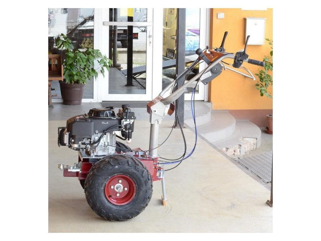 Stavebnicová kosačka s hydrostatickou prevodovkou, prestaviteľná na 15 rôznych pracovných funkcií s profesionálnym motorom s liatinovou vložkou Loncin 352 (obsah motora 352 ccm, krútiaci moment motora 21,1 Nm, výkon motora cca 11 HP) s ručným štartom a fúkanými kolesami 19x8