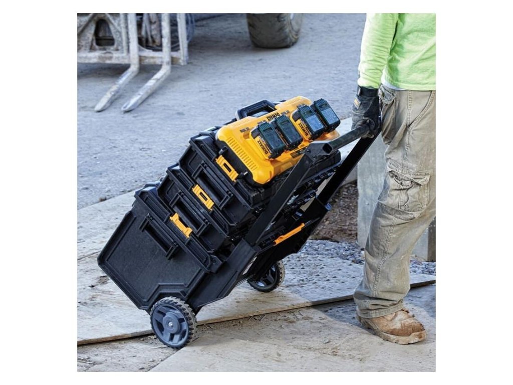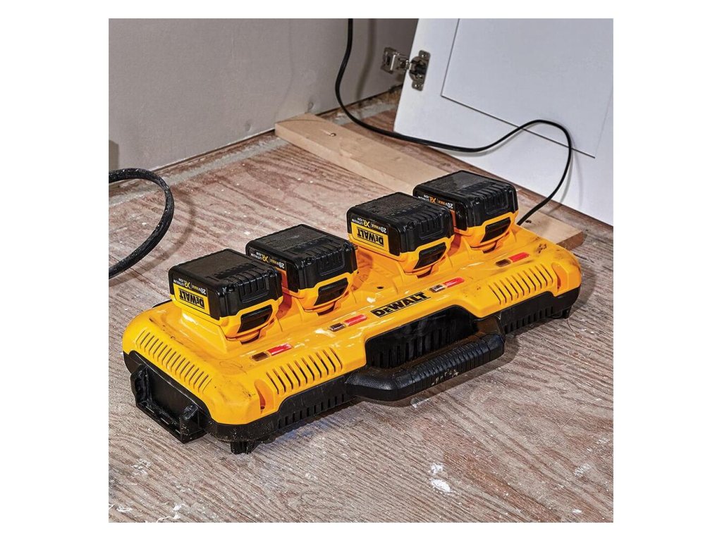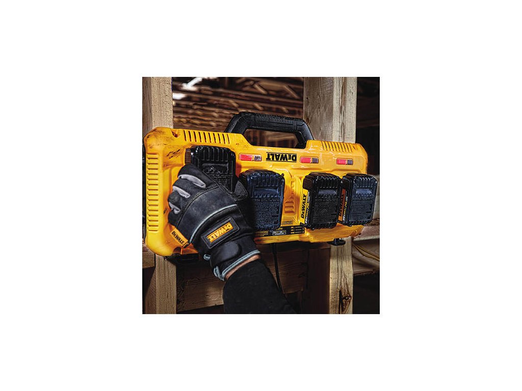 Rýchlonabíjačka DeWALT DCB104 vybavená štvoricou nabíjacích portov umožňuje nabíjať v jeden okamžite až štyri batérie 12 V, 18 V alebo 54 V Flexvolt. Nabíjačka DCB104 dokáže nabiť 18V aku batériu s kapacitou 5.0 Ah počas 50 minút a batériu 54V Flexvolt s kapacitou 9.0 Ah počas 75 minút. Nabíjačka DCB104 Je tiež kompatibilný so systémom ToughSystem.