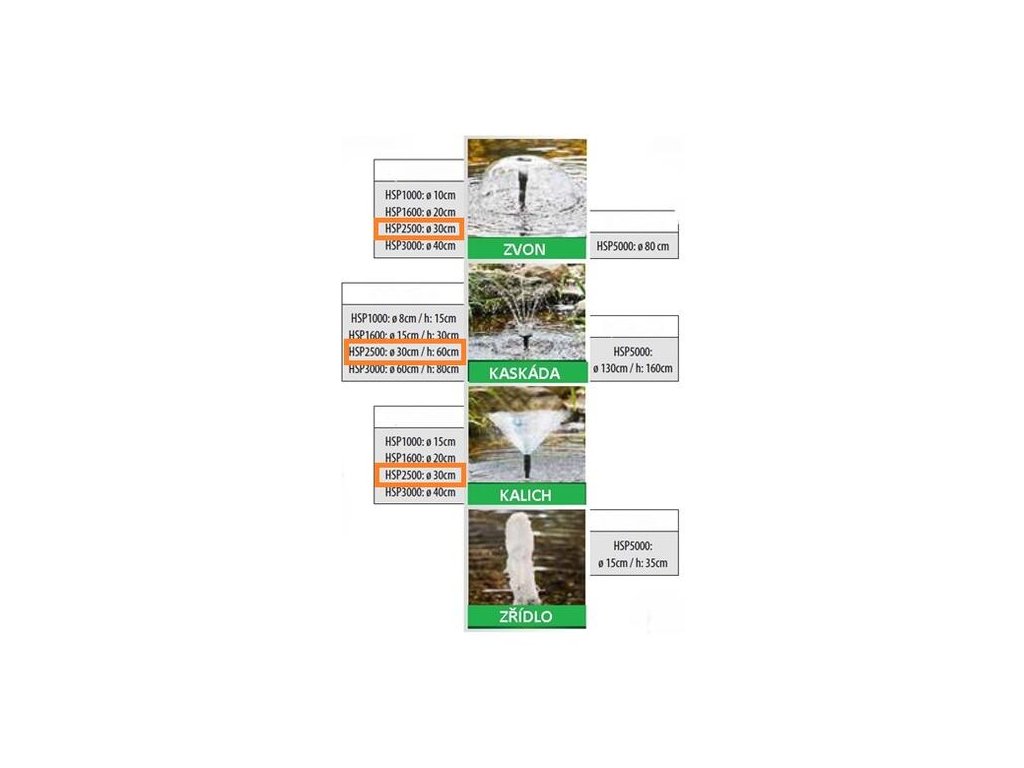 Čerpadlo má veľmi nízku spotrebu energie a vysoký stupeň účinnosti. Pri vývoji sa kládol dôraz na tichú prevádzku, funkčnosť a jednoduché čistenie. Čerpadlá sú určené pre záhradné jazierka, okrasné nádrže, rybníky, fontány, dekoratívne fontány a na okysličovanie vody. Pri stálej prevádzke je badateľná nízka spotreba. Jednoduchá údržba vďaka jednoduchej demontáži, bez použitia náradia. Je vybavené teleskopickou rúrou (20 až 48 cm) s kohútikom na reguláciu výšky účinku a pripojením k výtoku vody, možnosť regulácie sklonu teleskopickej rúry. Súčasťou sú 2 efektové nástavce na hru s vodou. Vrchný kryt čerpadla s jemnými filtračnými drážkami, neprepustí väčšie nečistoty, ktoré by mohli upchať efektovú vodnú trysku a znečistiť rotor.