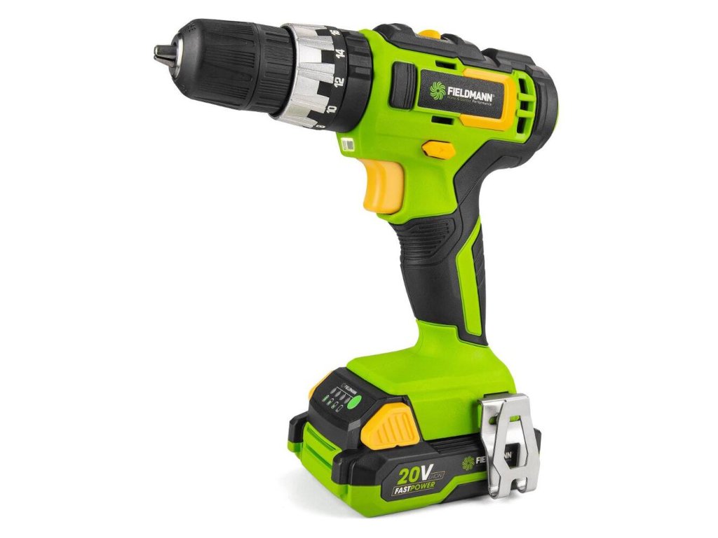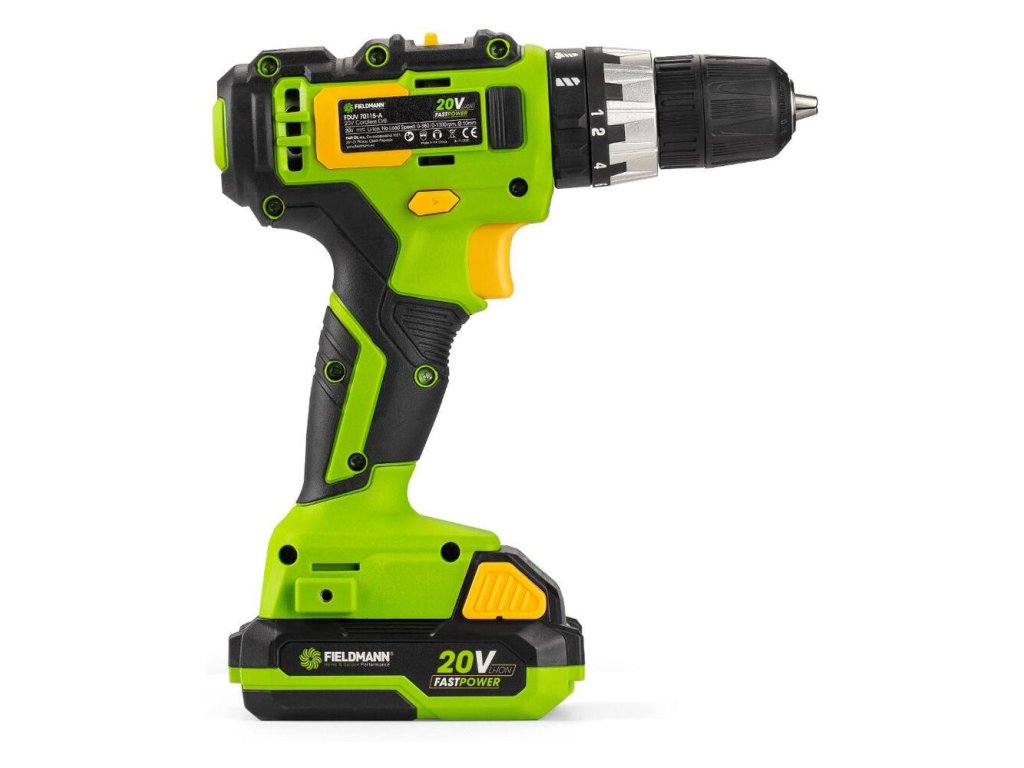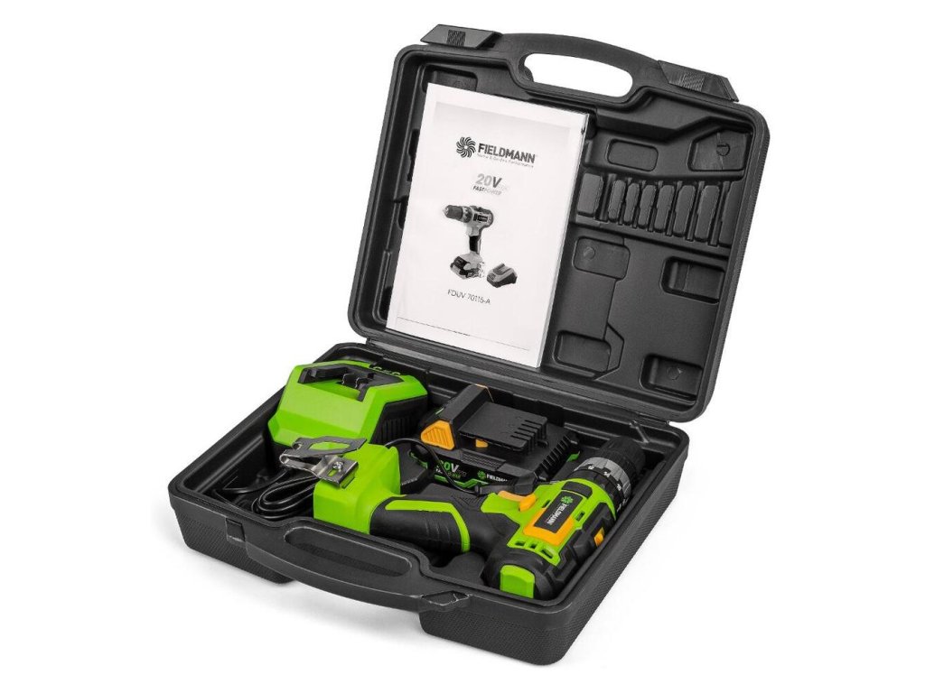- Vŕtačka je dodávaná v praktickom plastovom kufríku s rýchlonabíjačkou a 2 Ah akumulátorom, ktoré sú kompatibilné do všetkých výrobkov spoločnosti FIELDMANN radu FAST POWER 20V.