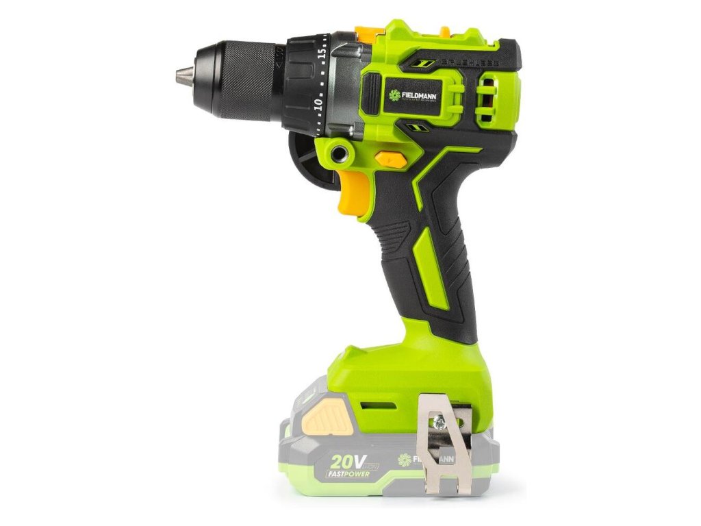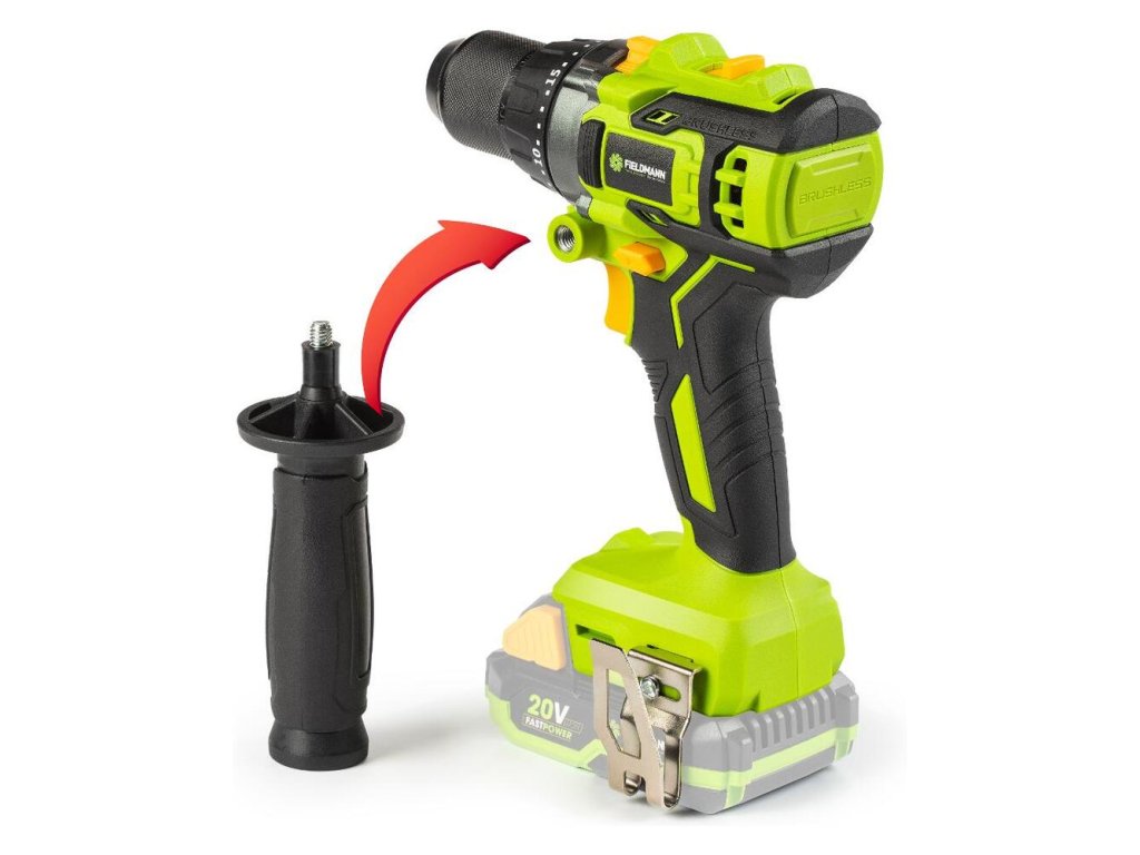 AKU vŕtačka s príklepom značky FIELDMANN s najmodernejším bezuhlíkovým motorom zaistí výkon bez kompromisov. Bezuhlíková technológia motora zaisťuje efektívne využitie plnej kapacity batérií a dlhšiu životnosť celého stroja. Ergonomická rukoväť s prídavným madlom zaistí možnosť na dlhšiu prácu bez bezpečnostných problémov, to všetko pri nadpriemernom točivom momente až 60 Nm. O komfortnú prácu sa tiež postará pracovné LED svetlo vďaka ktorému bude stará práca v dielni jednoduchšia. Je možné použiť akumulátory s kapacitou 2 Ah/4 Ah, ktoré sú kompatibilné do všetkých výrobkov radu FAST POWER 20 V.
