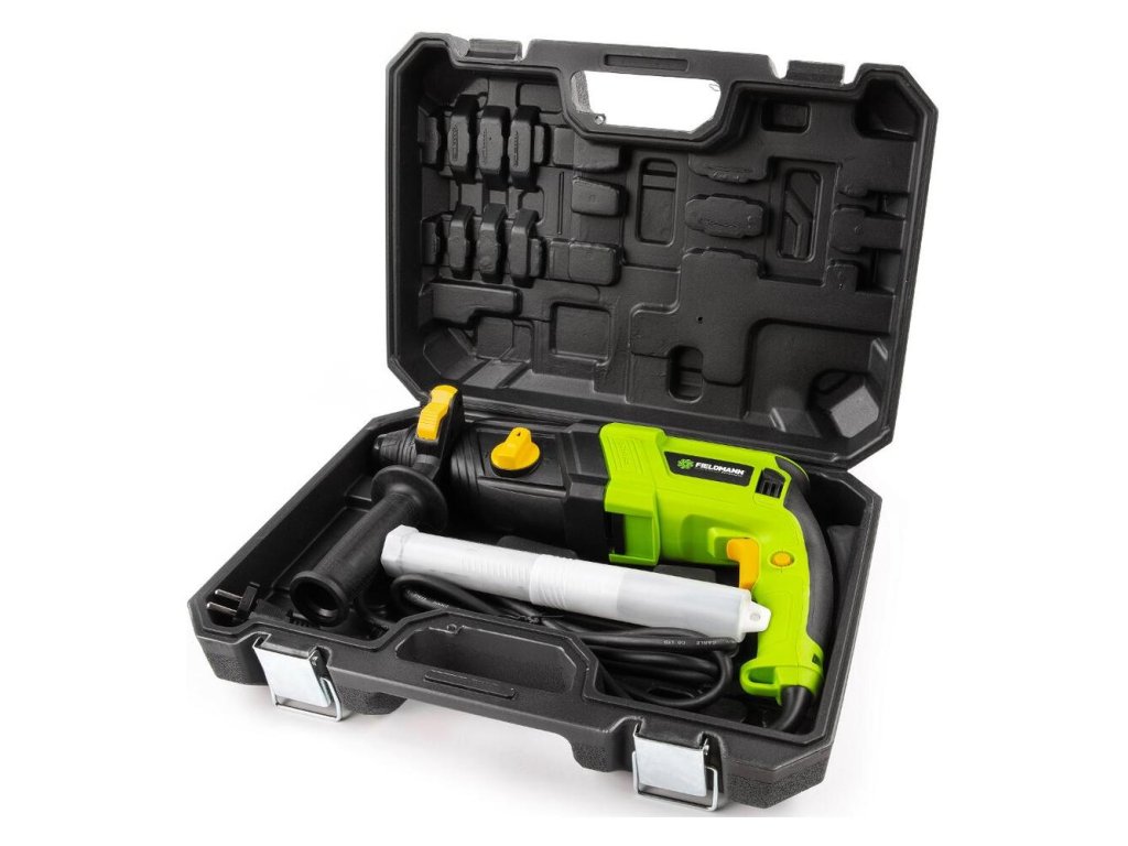 Vŕtacie kladivo renomovanej značky FIELDMANN je dokonalý pomocník každého majstra určený na vŕtanie a sekanie do betónu, kameňa či tehál. Stačí len použiť príslušný vrták alebo sekáč, ktorých výmena je veľmi jednoduchá a rýchla vďaka použitému systému upínania SDS PLUS. To všetko doplnené o nadpriemerný príkon 850 W. Podľa ľubovôle môžete tiež zvoliť aj vŕtanie bez príklepu ako s bežnou vŕtačkou. Otáčky kladiva pohodlne regulujete tlakom na príslušný vypínač. Vŕtacie kladivo je dodávané v praktickom plastovom kufríku vrátane hĺbkového dorazu a prídavného madla.