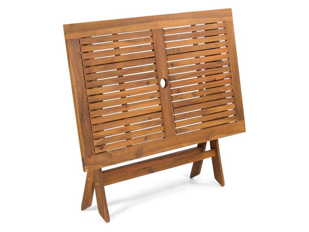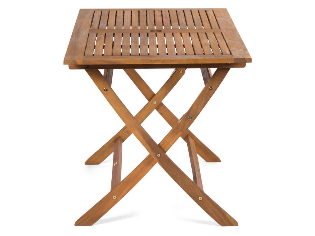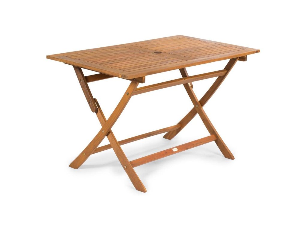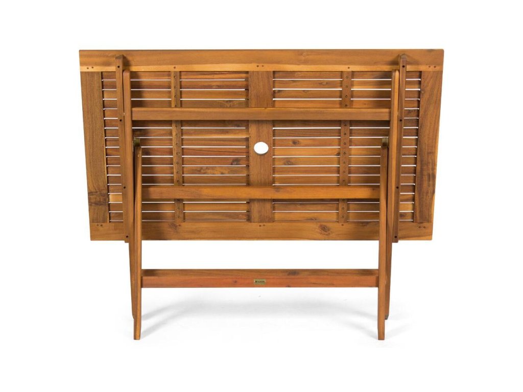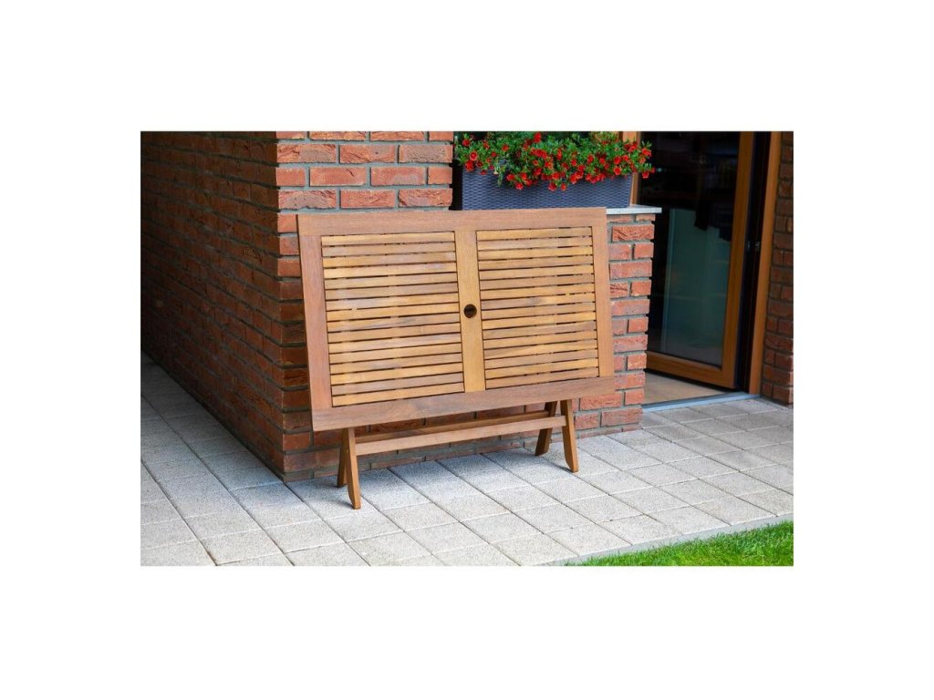Drevený stôl s otvorom na slnečník vhodný do každej záhrady.