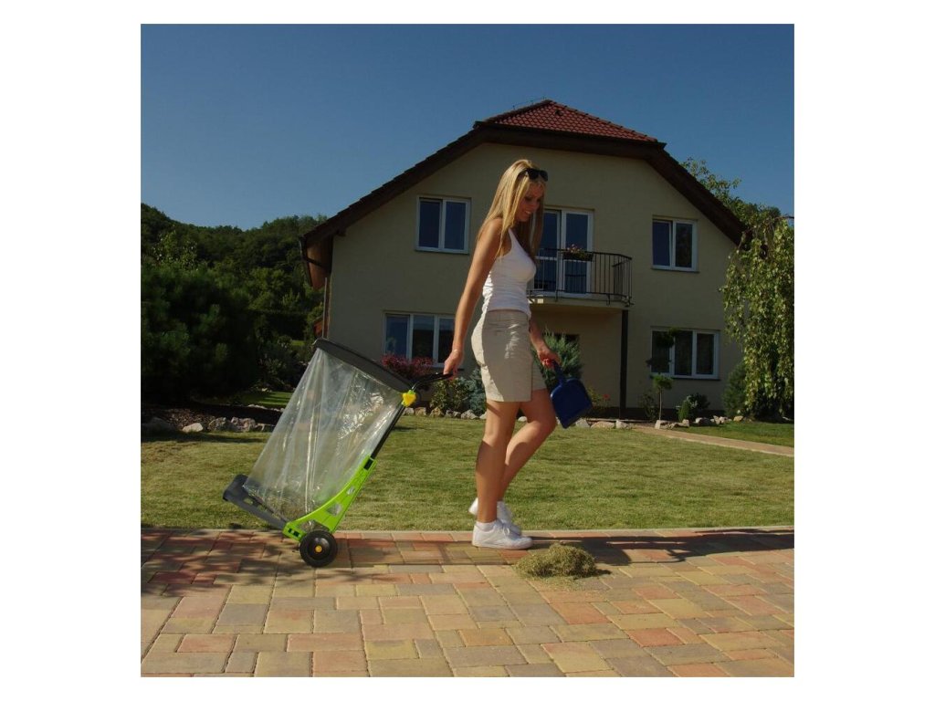 Praktický plastový vozík na zber lístia a iného záhradného odpadu. Súčasťou balenia je aj plastový zberný vak s kapacitou 80 l a nosnosťou 25 kg. Hrúbka vaku je 0,03 mm. Možnosť opakovaného použitia vaku. Tento vak môžete nahradiť alebo doplniť štandardným plastovým vakom na odpad. Vak je upevnený pomocou klipu. Premiestňovanie vozíka uľahčia kolieska s priemerom 145 mm. Výška rukoväte je 530 mm, pričom celková výška vozíka je 942,5 mm.