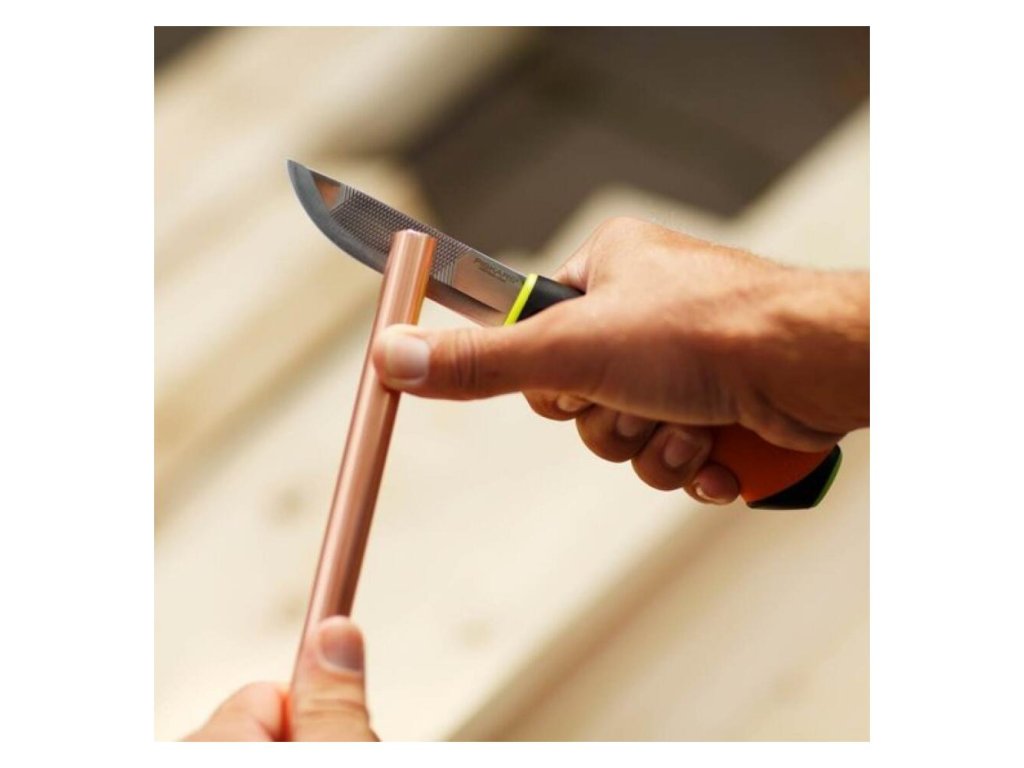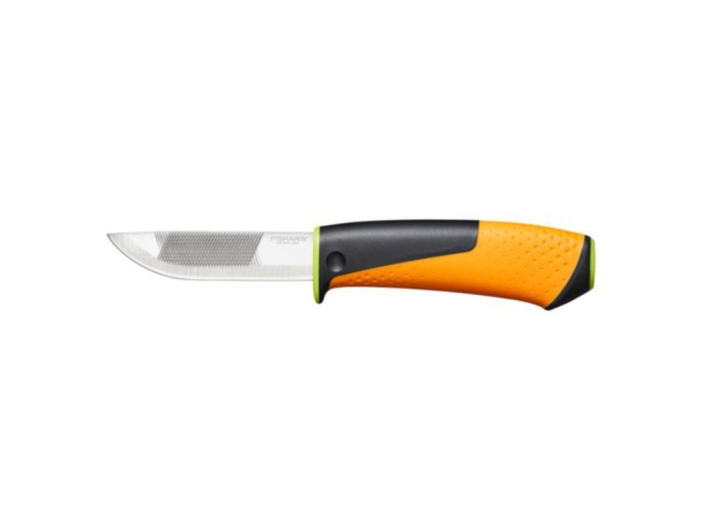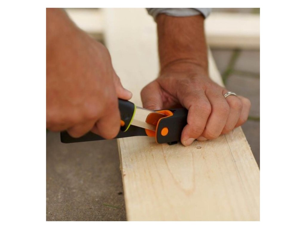 Nôž na náročnú prácu Fiskars s brúsikom je univerzálny nôž s čepeľou z hrubšej vysoko kvalitnej ocele, ktorá znesie hrubšie zaobchádzanie. Je súčasťou nového radu univerzálnych nožov Fiskars s integrovaným brúsikom, ktorý bol vyvinutý v spolupráci s najnáročnejšími používateľmi nožov.