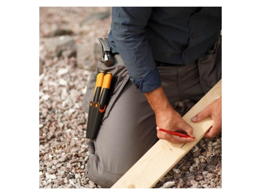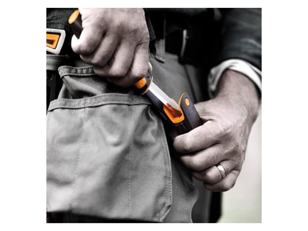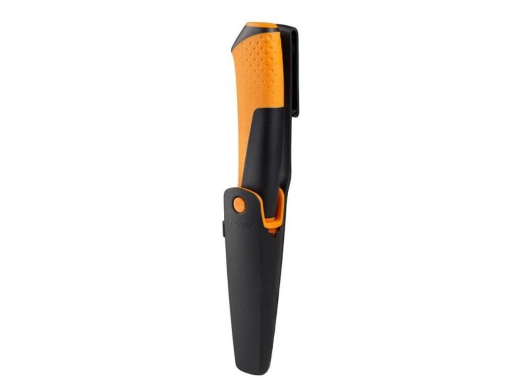 Univerzálny nôž Fiskars s brúsikom je univerzálny nôž s čepeľou z vysoko kvalitnej ocele. Je súčasťou nového radu univerzálnych nožov Fiskars s integrovaným brúsikom, ktorý bol vyvinutý v spolupráci s najnáročnejšími používateľmi nožov. Inovatívny, vstavaný brúsik máte vždy pri sebe, a môže si tak byť istí, že nikdy nebudete musieť rezať tupým nožom alebo prerušiť prácu.Rukoväť má ergonomický tvar a je mäkká, s unikátnou vzorkou, ktorá zariadi maximálnu kontrolu uchopenia presne tam, kde je treba, a hladkým povrchom tam, kde je potreba viac mobility. Inovatívne puzdro je otočné, aby ho mohli rovnako pohodlne používať praváci i ľaváci.