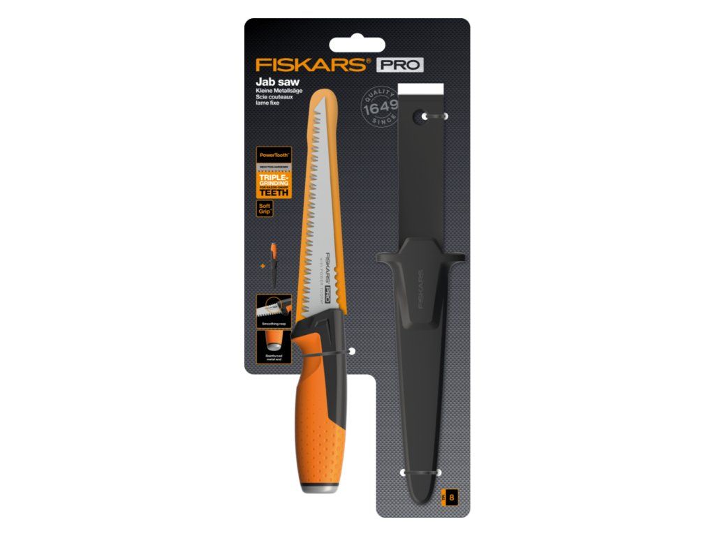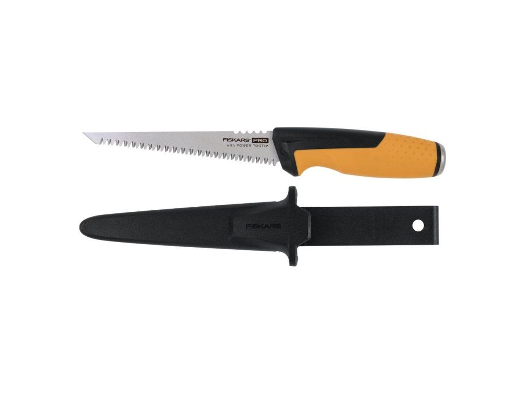 Píla Fiskars Pro Power Tooth Jab maximalizuje odolnosť a bezpečnosť vďaka priloženému odolnému a robustnému plášťu
