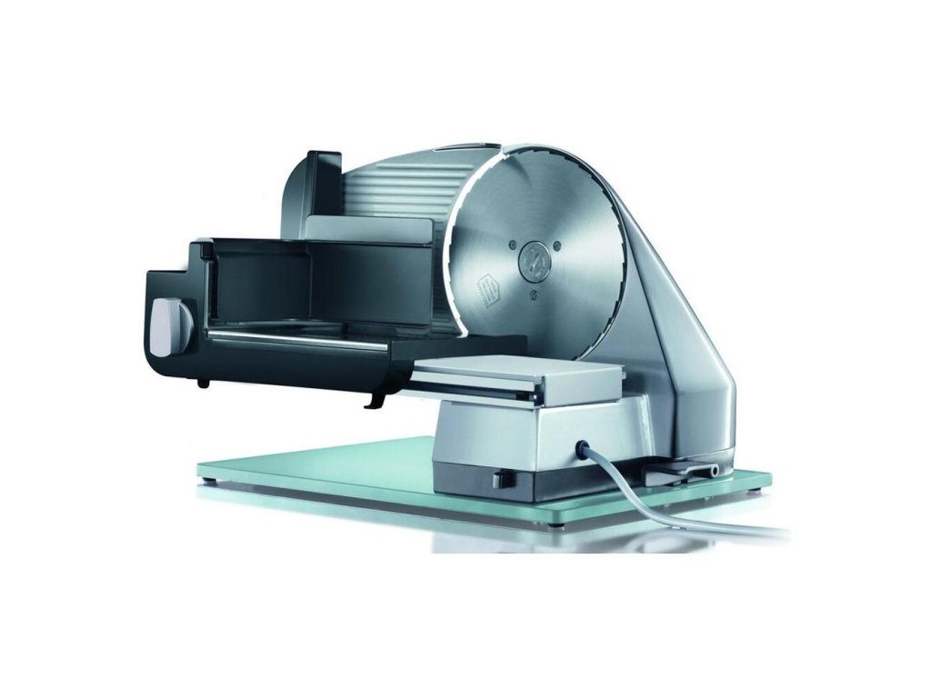 Celokovový krájač disponuje motorom s príkonom 170W. V jeho výbave nájdete zúbkovaný rezný kotúč z najkvalitnejšej ocele vyrobený v Nemecku. Veľkosť kotúča tvorí 170 mm. Samozrejmosťou je spínač posunu držiaka potravín, sklenená podstavcová doska a detská poistka. Nechýba priestor pre uloženie prívodného kábla. V ponuke nájdete tiež držiak potravín s chráničom prstov a praktický plastový podnos.