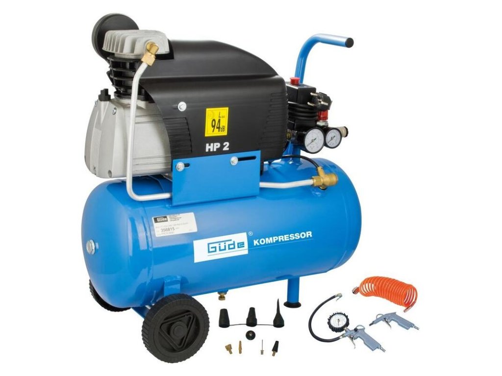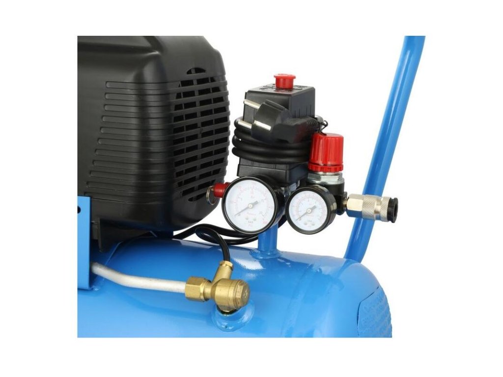 Jednovalcový kompresor s olejovým mazaním, s priamym pohonom. Tlakový spínač, manometer tlaku v nádobe a manometer pracovného tlaku, 1 spojka na stlačený vzduch, redukčný ventil pracovného tlaku, poistný ventil, bezpečnostný ventil, spätný ventil, vypúšťací ventil na kondenzát. Vzduchový filter. Noha s gumovým nárazníkom, plastové kolesá, prepravná rukoväť. Sada náradia na stlačený vzduch obsahuje 5 m PU hadicu špirálovú so spojkou, fúkaciu pištoľ, hustilku pneumatík, 3 ks plastových adaptérov, 5 ks mosadzných adaptérov.
