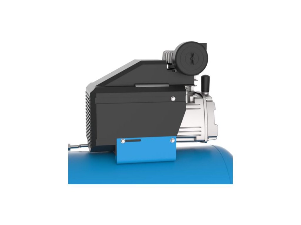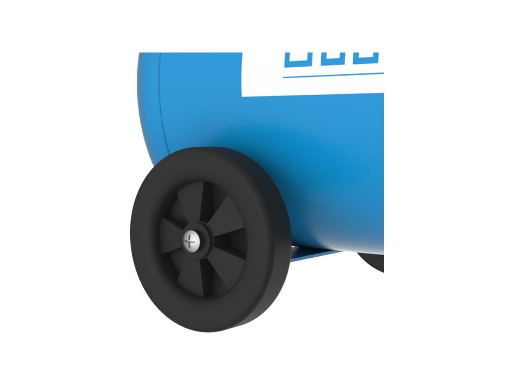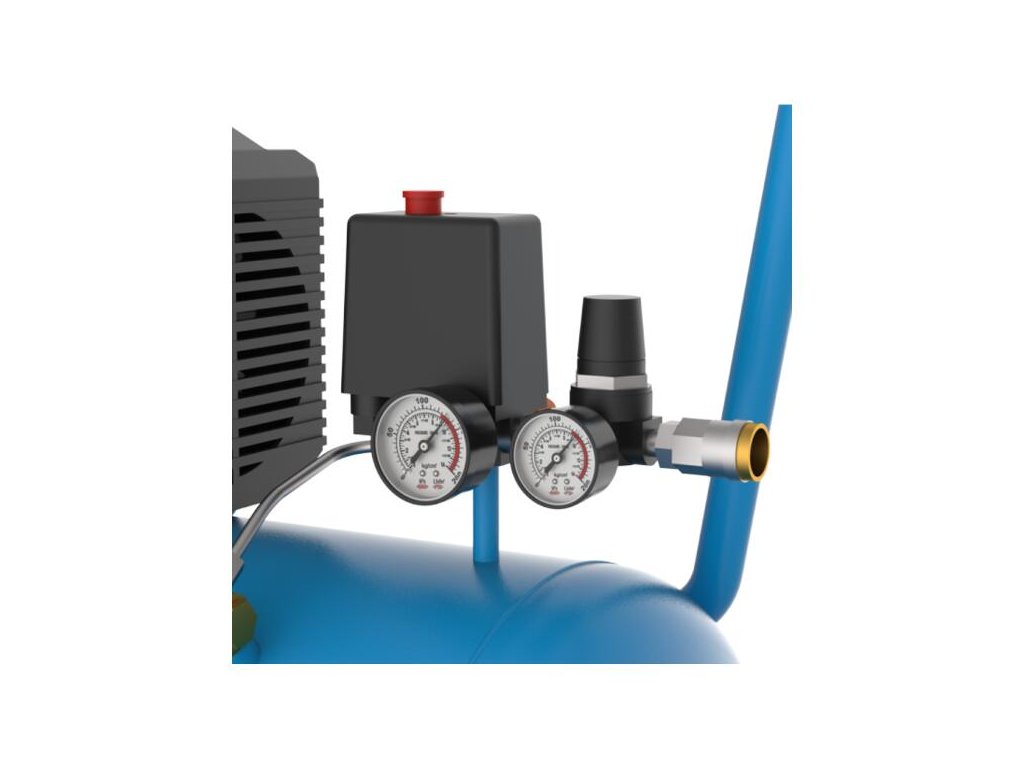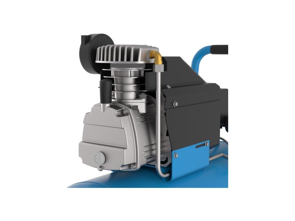 Jednovalcový piestový kompresor s olejovým mazaním, priamy pohon, dva manometre (manometer na meranie tlaku v nádobe a manometer na meranie pracovného tlaku), jedna spojka na stlačený vzduch, redukčný, bezpečnostný a spätný ventil, vzduchový filter, transportná rukoväť. Nožičky s gumovým dorazom, plastové kolesá.