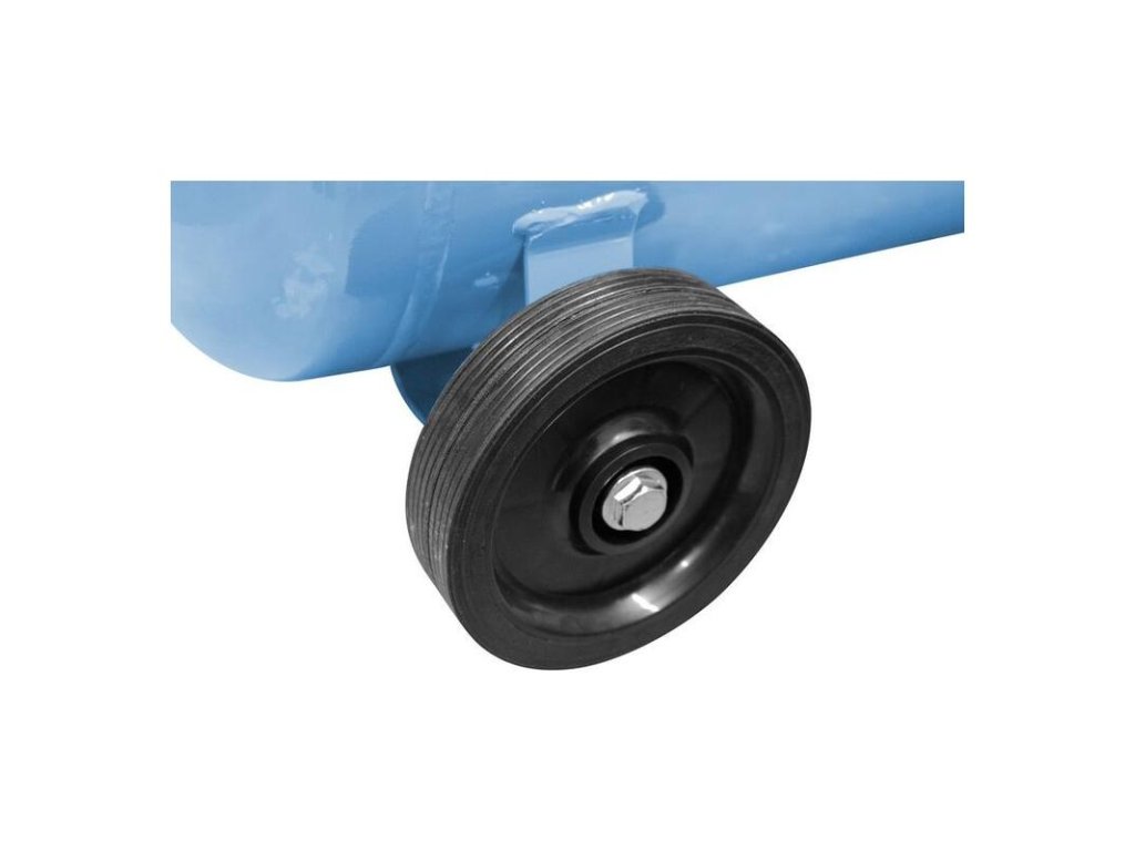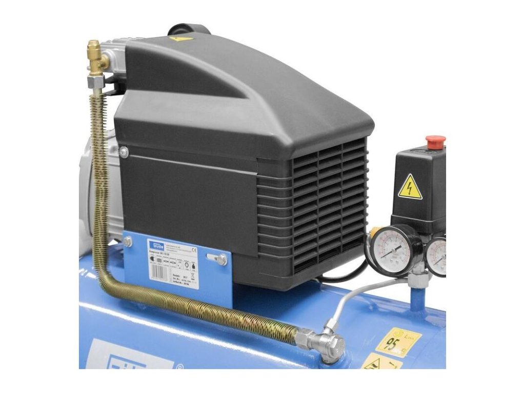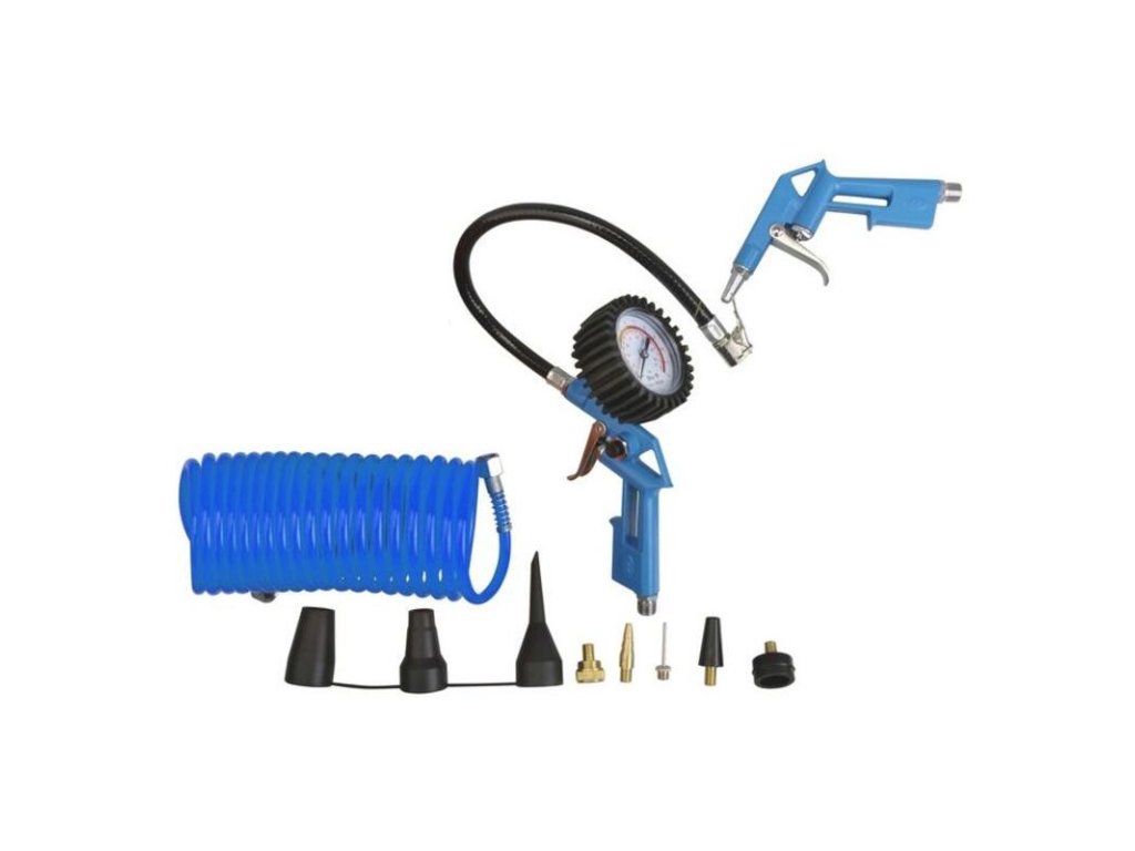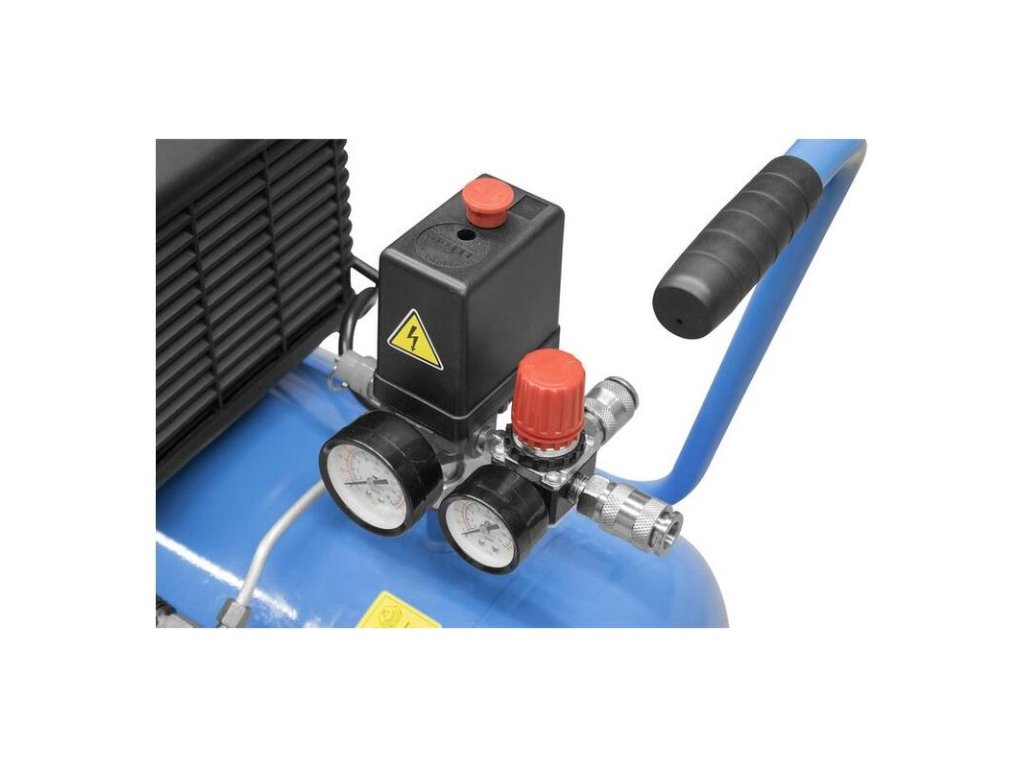 Jednovalcový kompresor s olejovým mazaním, s priamym pohonom. Manometer tlaku v nádobe a manometer pracovného tlaku, 2 spojky na stlačený vzduch, redukčný ventil, poistný ventil, vypúšťací ventil na kondenzát. Dvojitá noha s gumovým nárazníkom, plastové kolesá, prepravná rukoväť. Sada náradia na stlačený vzduch obsahuje 5 m PU hadicu špirálovú so spojkou, fúkaciu pištoľ, hustilku pneumatík, 8 ks adaptérov na nafukovacie matrace, lopty a podobne.