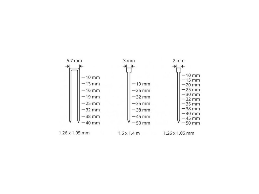 - Hrúbka + dĺžka klincov s priemerom hlavičky 3 mm: 1,6 x 1,4 mm + 25 mm / 38 mm