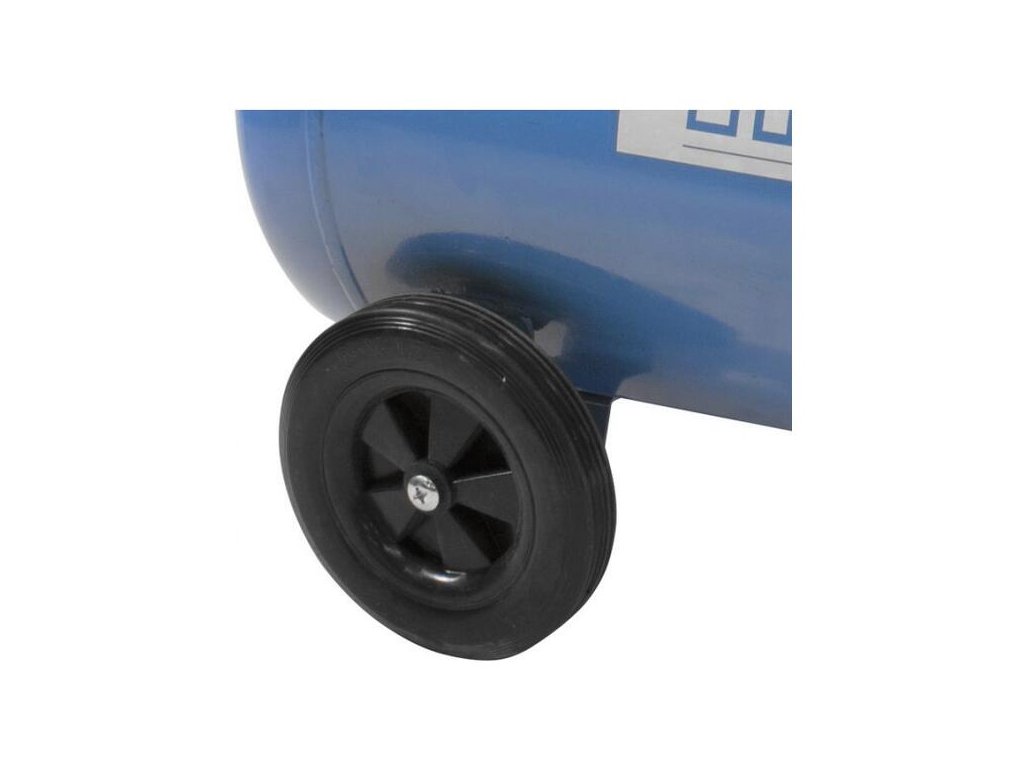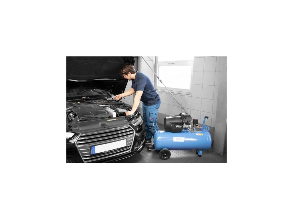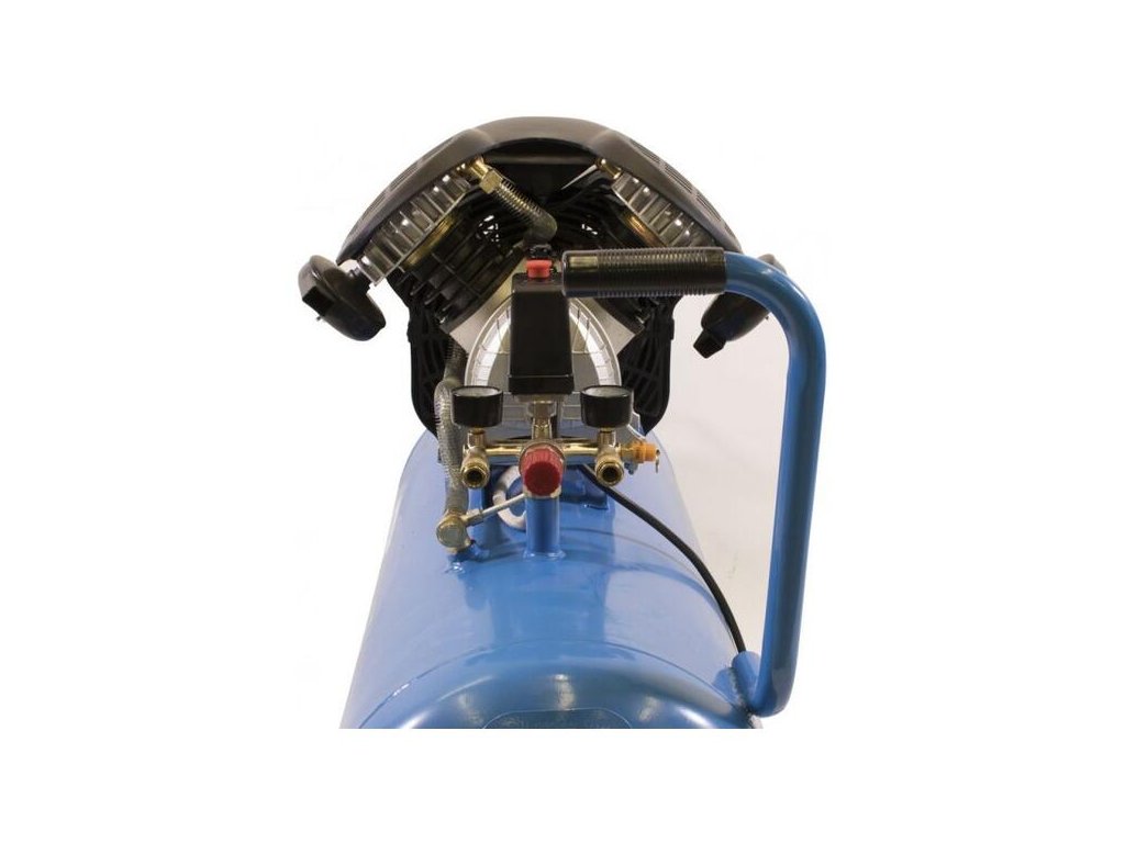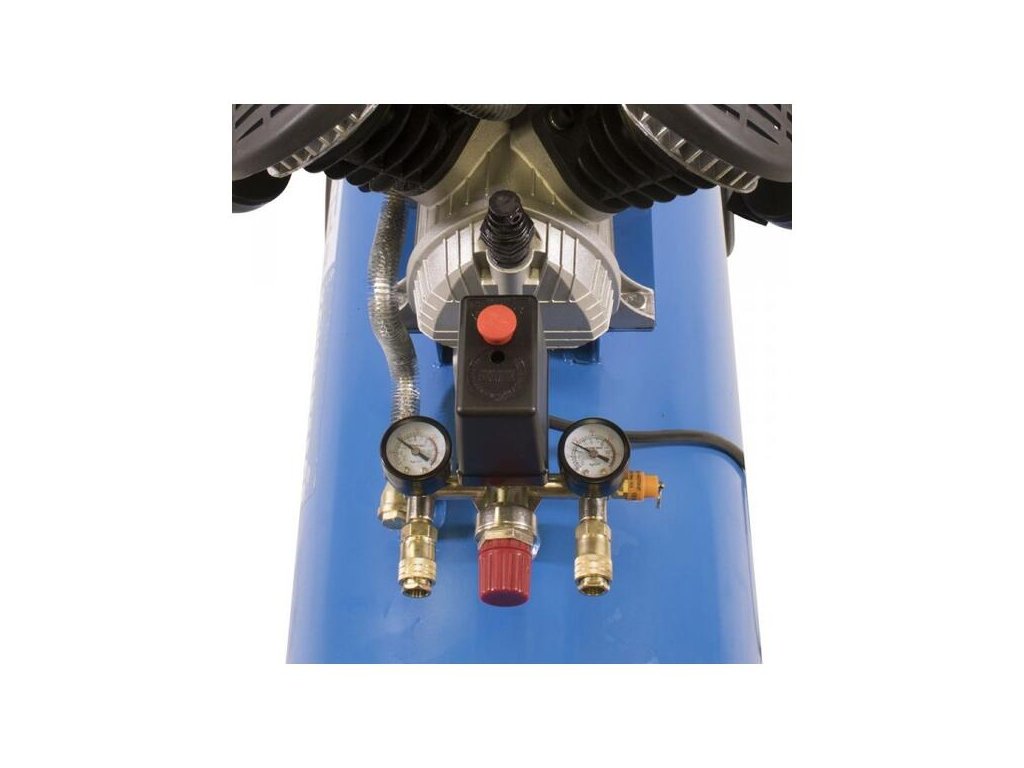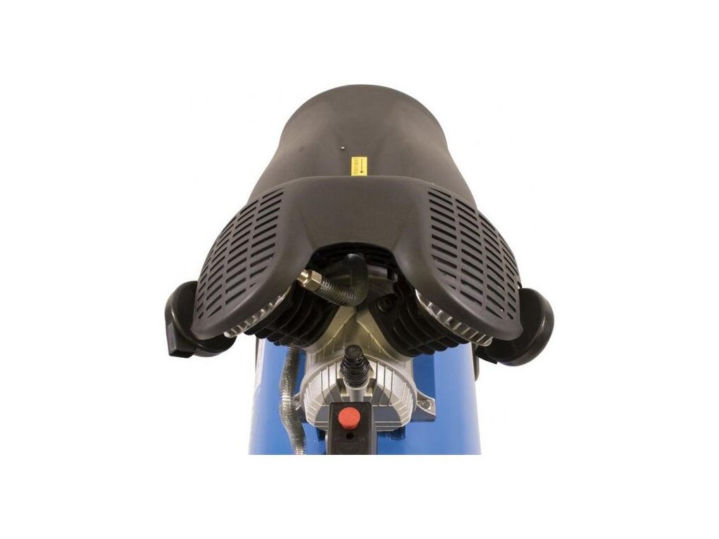 Dvojvalcový V-agregát s olejovým mazaním, s priamym pohonom. Tlakový spínač, manometer tlaku v nádobe a manometer pracovného tlaku, 2 spojky na stlačený vzduch, poistný ventil. Dvojitá noha s gumovým nárazníkom, plastové kolesá, prepravná rukoväť.