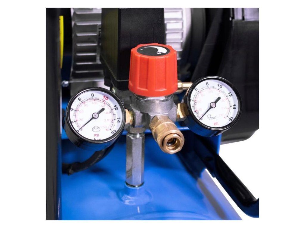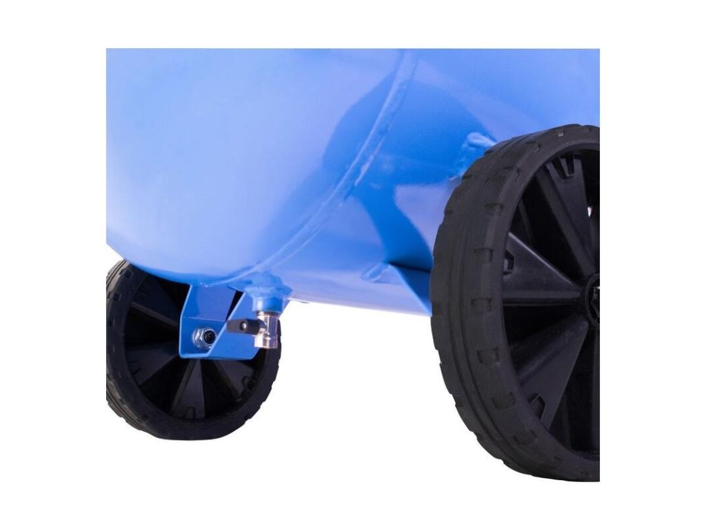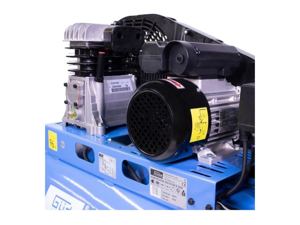 Dvojvalcový kompresor s olejovým mazaním, s remeňovým pohonom. Tlakový spínač, manometer tlaku v nádobe a manometer pracovného tlaku, 2 spojky na stlačený vzduch, dodatočný chladič, poistný ventil, spätný ventil, vypúšťací ventil na kondenzát, vzduchový filter, ochrana proti preťaženiu. Dve otočné riadiace kolieska, plastové kolesá, prepravná rukoväť.