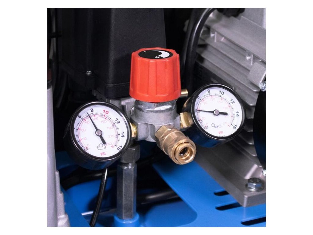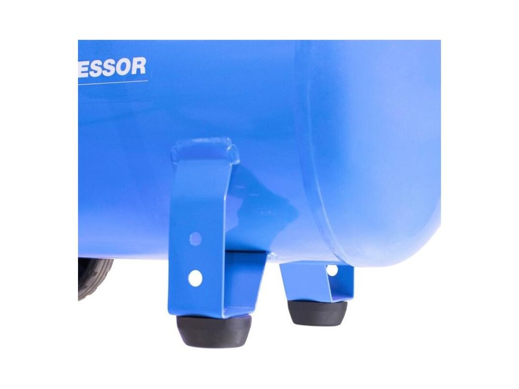 Dvojpiestový kompresor s olejovým mazaním, s remeňovým pohonom. Tlakový spínač, manometer tlaku v nádobe a manometer pracovného tlaku, 2 spojky na stlačený vzduch, dodatočný chladič, poistný ventil, spätný ventil, vypúšťací ventil na kondenzát, vzduchový filter, ochrana proti preťaženiu. Dvojitá noha s gumovým nárazníkom, plastové kolesá, prepravná rukoväť.