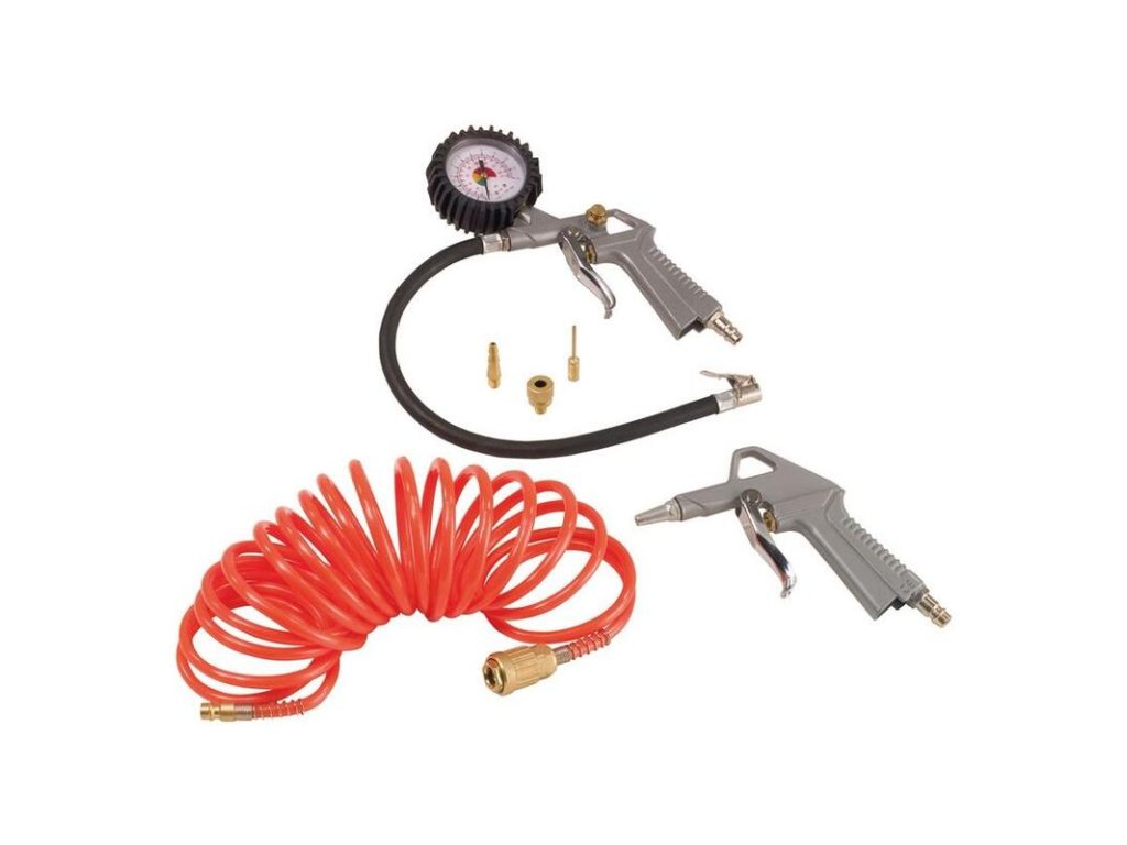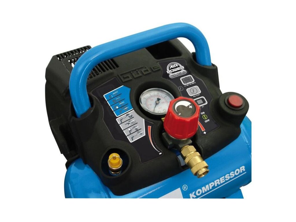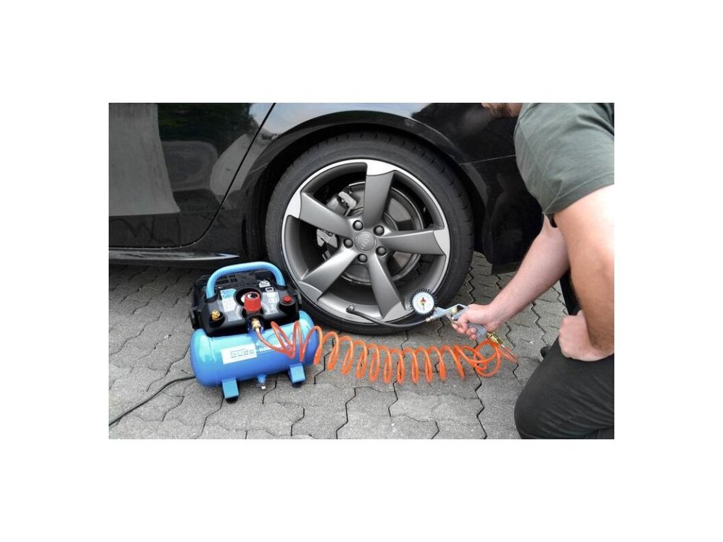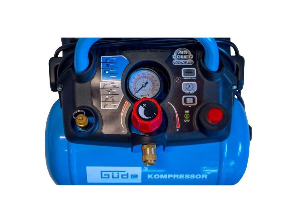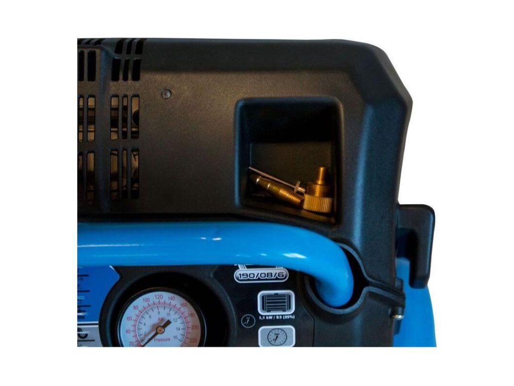 Bezolejový 1-valcový kompresor s remeňovým pohonom a 6 litrovou nádobou, manometer pracovného tlaku, nastaviteľný tlakový spínač, redukčný ventil, 5 m špirálová hadica, vypúšťací ventil kondenzačnej vody, vyfukovacia pištoľ, adaptéry na fúkanie pneumatík, lôpt, matracov.