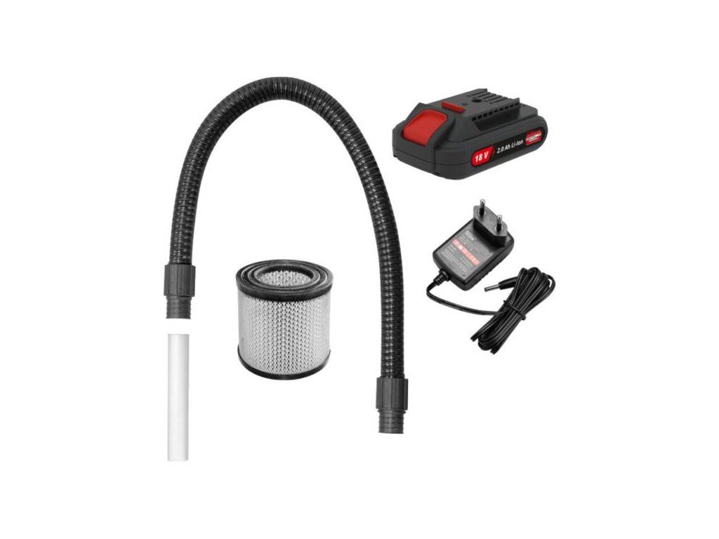 Akumulátorový vysávač na popol zo série akumulátorového náradia 18V E3 na použitie okolo domu a v záhrade. 15-litrová nádoba, 1 meter dlhá nasávacia hadica, hliníková nasávacia rúrka, HEPA filter na jemný prach. Vrátane akumulátora 2,0 Ah a nabíjačky.