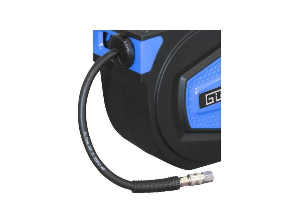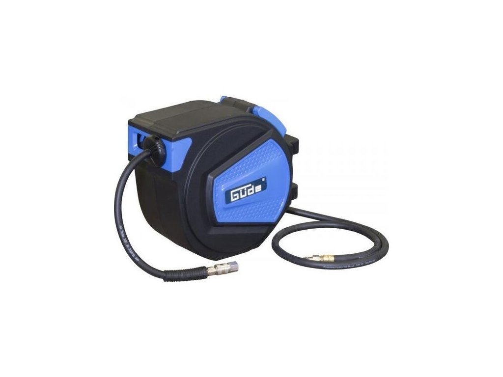 Automatický bubon s hadicou na stlačený vzduch, nárazuodolné plastové puzdro s praktickou rukoväťou otočnou o 180° na obe strany. Hadica na stlačený vzduch je mäkká, odolná voči zalomeniu, oteru a chemickým látkam, poddajná, ľahko sa s ňou manipuluje aj pri teplotách do -20 °C. Vrátane materiálu na montáž na stenu. Stupňovité automatické navíjanie s ASRC (Automatic-Slow-Retraction-Control) zaisťuje optimálnu bezpečnosť s pomalým a kontrolovaným navíjaním a zabraňuje tomu, aby sa koniec hadice zasunul veľkou rýchlosťou. Hadicu možno prejsť vozidlom aj pod tlakom.
