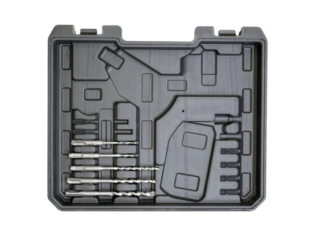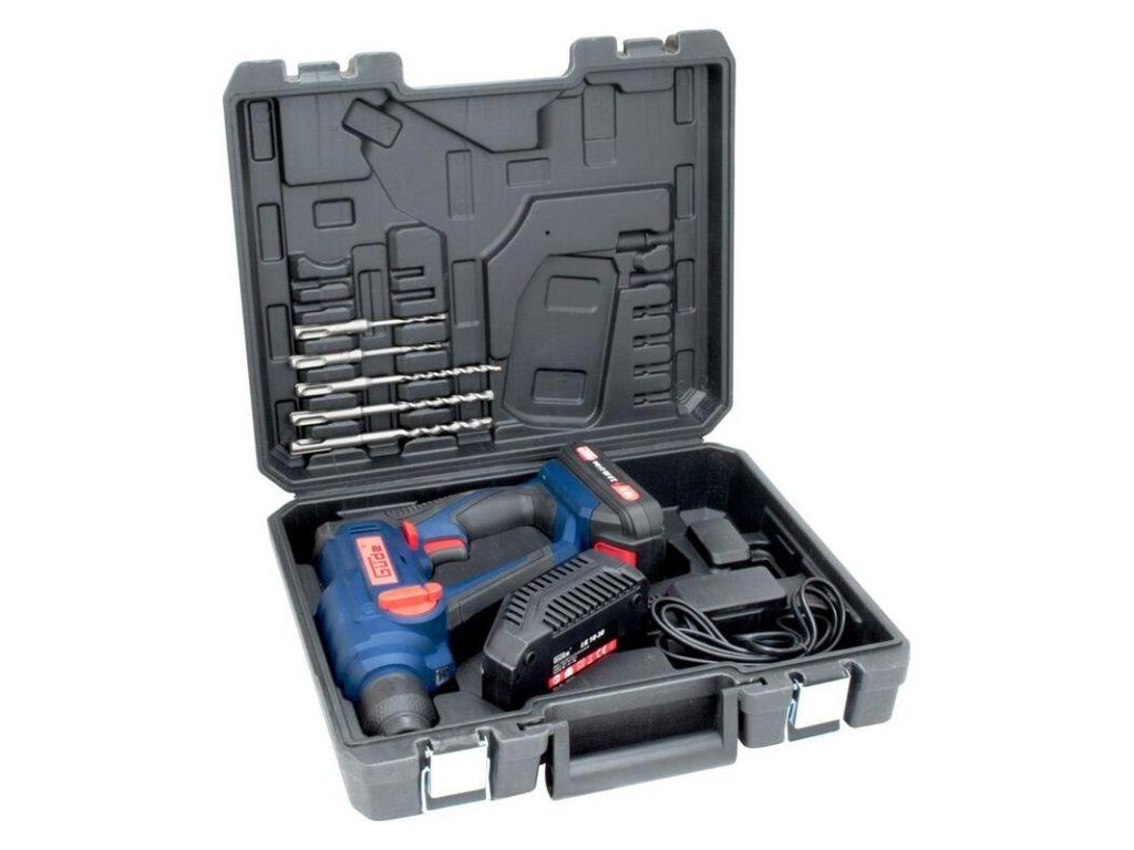 Akumulátorové búracie kladivo zo série akumulátorového náradia 18V E3. Búracie práce (s použitím príklepu) alebo vŕtanie (bez použitia príklepu). Možnosť vypnutia príklepu pri vŕtaní do dreva alebo do kovu. Rýchloupínacie skľučovadlo SDS plus na výmenu vrtákov bez použitia náradia. Regulácia otáčok. Poistka proti preťaženiu. Ľahký a kompaktný dizajn. Pravo/ľavotočivý chod. Integrovaná LED na osvetlenie pracovnej oblasti. Mäkká ergonomicky tvarovaná rukoväť pre bezpečnú prácu. Akumulátor 18V/2,0 Ah s kontrolou jednotlivých článkov a ochranou voči preťaženiu, rýchlonabíjačka 3,0 A, 5 x SDS-plus vrták Ø 4/5/6/8/10 mm, kufrík s kovovými uzávermi.