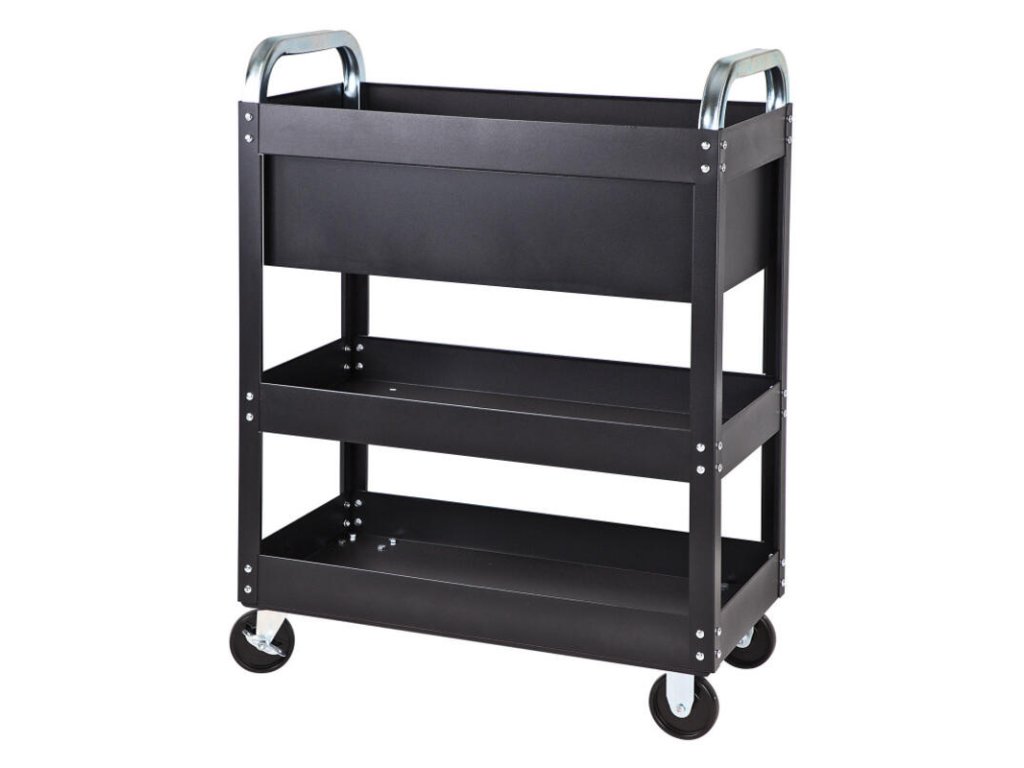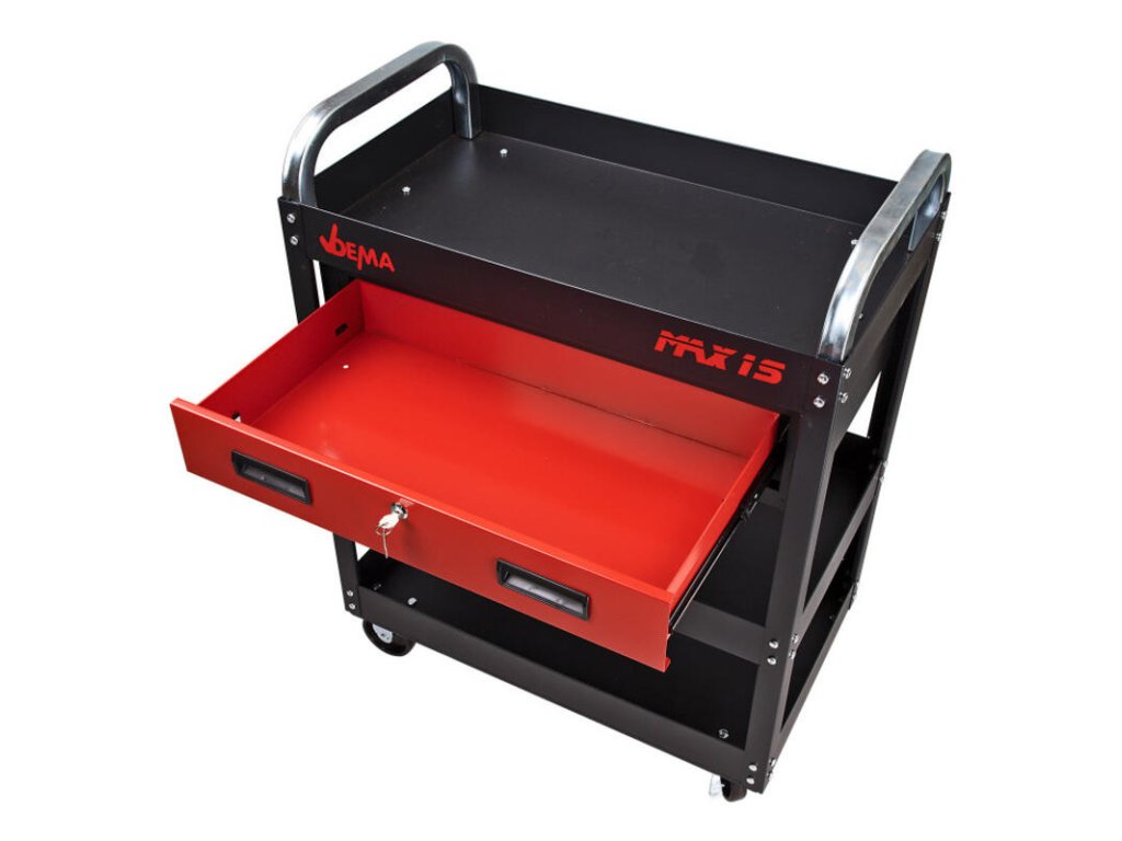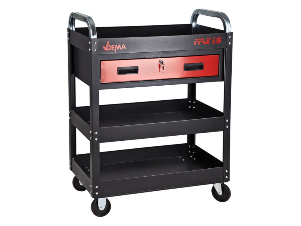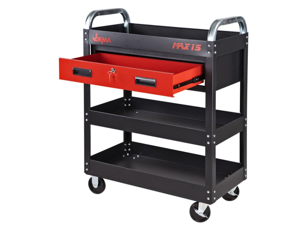 Trojposchodový servisný vozík vhodný na servisné práce, súčiastky, montáž, prepravu a do dielne. Vďaka veľkým kolesám sa ľahko a plynule presúva a je flexibilný. Extra stabilné štvorhranné držadlá na posúvanie sa dobre držia a sú pripevnené presne v tej správnej výške. Do uzamykateľnej zásuvky sa zmestí všetko, čo chcete chrániť pred prístupom iných. Celooceľová konštrukcia s povrchovou úpravou práškovaním. Dva otočné kolesá (každé s brzdou) a dva pevné kolesá. Vysoké okraje pre bezpečnú prepravu. Posuv zásuvky na guľôčkových ložiskách. Uzamykateľná zásuvka s výsuvom do 7/8 hĺbky. Dodáva sa v demonte.