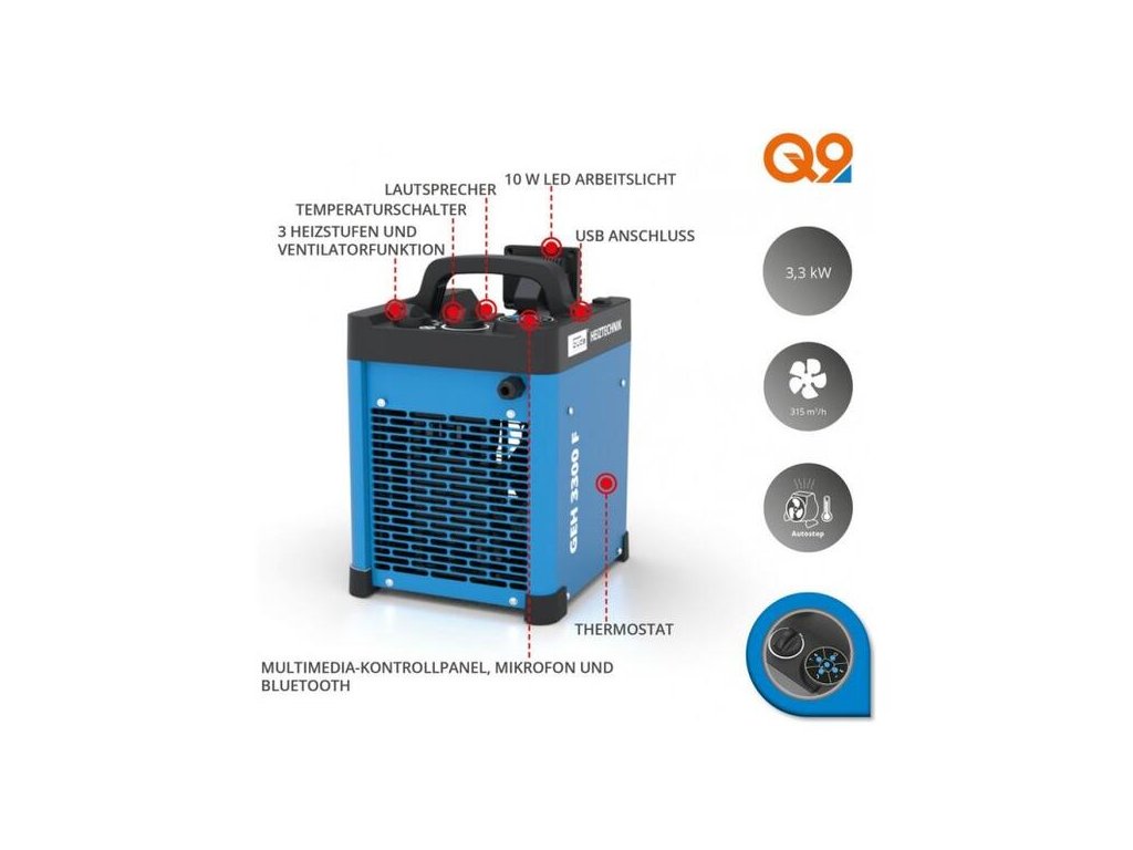 Elektrický ohrievač s funkciou vykurovania a ventilátora. Praktická rukoväť na prenášanie, ochrana proti prehriatiu, termostat. Možnosť bezdrôtového spojenia s mobilným telefónom. Mobilný telefón sa dá podmienečne ovládať prostredníctvom ovládacieho panela (pri bezdrôtovom pripojení). Reproduktor je možné používať ako telefónny prístroj alebo na prehrávanie hudby, k dispozícii USB pripojenie, LED svetlo 10 W pre tmavé miestnosti a nastaviteľný uhol 90°.
