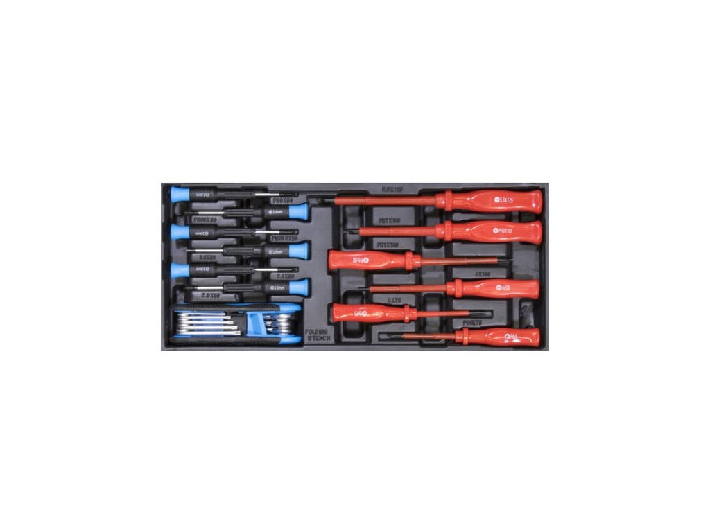 Izolované skrutkovače ploché 3*75, 4*100, 5*125 mm, izolované skrutkovače krížové 0*75, 1*100, 2*100 mm, viaczubé kľúče, skrutkovače na jemnú mechaniku krížové 0,1,2 / ploché 1,2,3, v plastovej vložke do zásuvky.