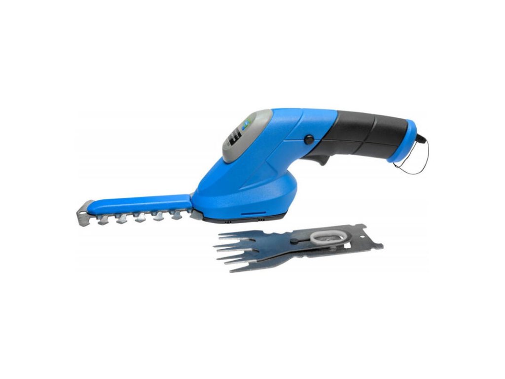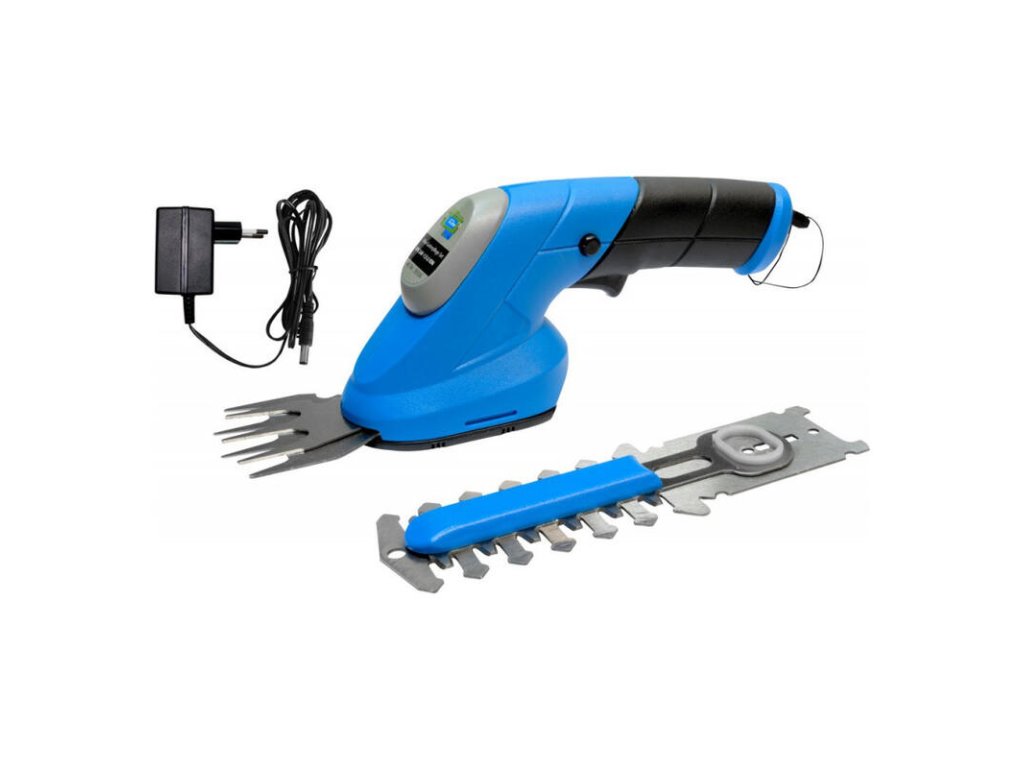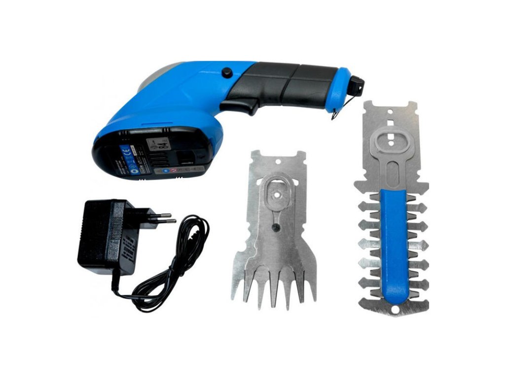 - Záhradnícka sada obsahuje násadu nožníc na trávu, násadu nožníc na kroviny/živý plot, integrovanú batériu 3,6 V / 1,5 Ah, nabíjačku, mäkkú rukoväť.