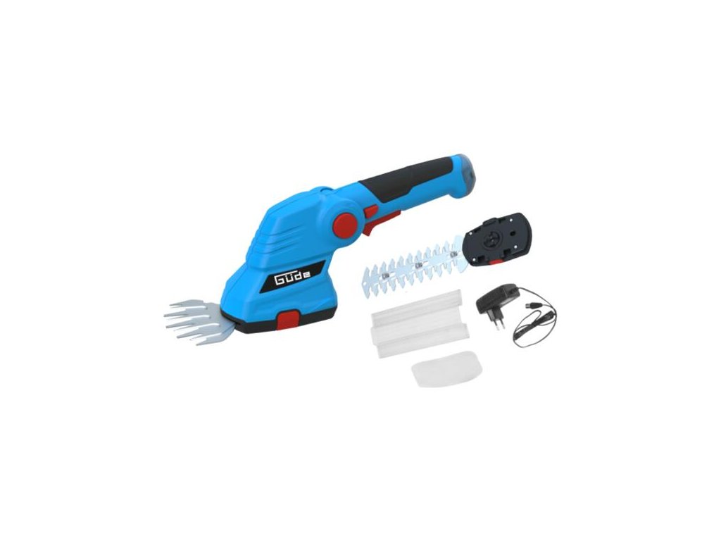 Akumulátorový záhradnícky set s násadou na strihanie trávy, násadou na strihanie živých plotov a kríkov, integrovaným akumulátorom 7,2 V / 1,5 Ah, vrátane nabíjačky. Trojpolohová sklopná rukoväť, rýchla výmena nožníc na trávu alebo nožníc na živé ploty/kríky bez použitia náradia. Čas nezaťaženého voľnobehu nožníc na trávu približne 55 minút a násady na strihanie živých plotov a kríkov približne 85 minút.