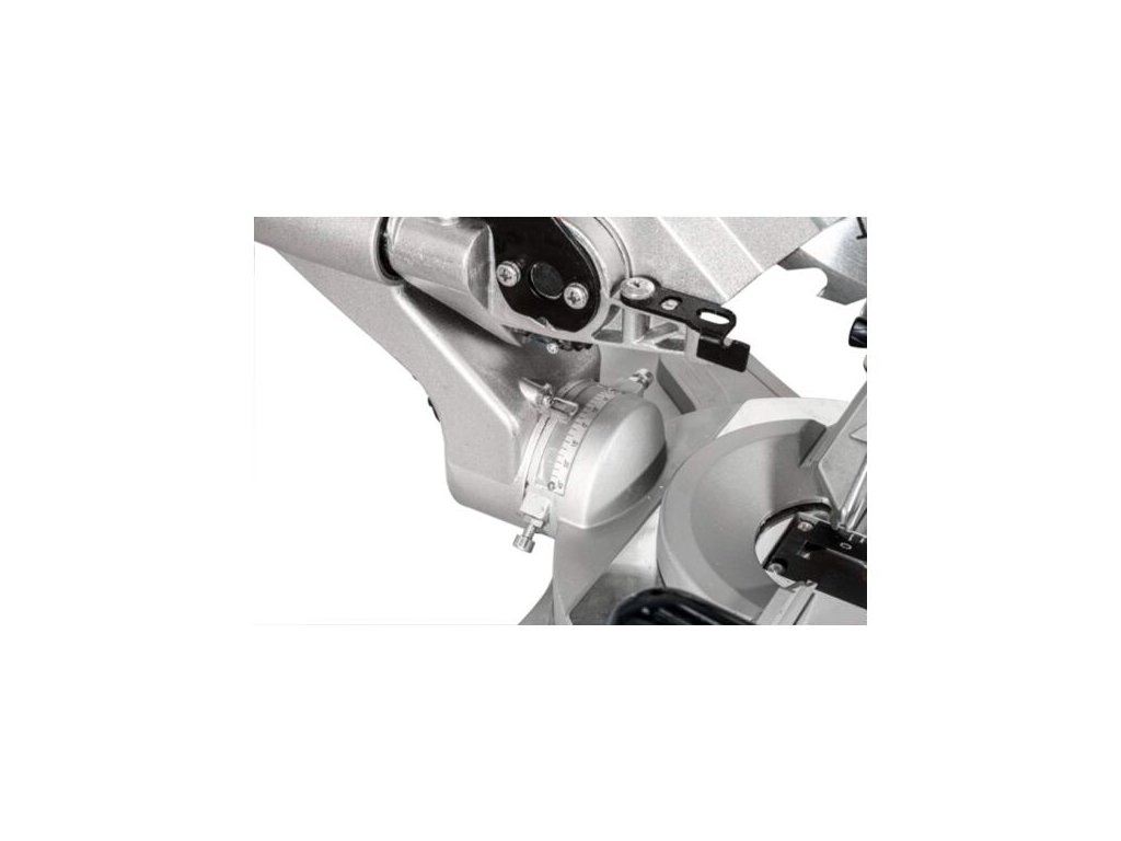 Radiálna kapovacia píla s plynule, obojstranne otočnou pílovou hlavou. Radiálne vedenie uložené v guľôčkových ložiskách, laser, svorka na uchytenie obrobku, široký pracovný stôl, vysoký hliníkový doraz, vrecko na zachytávanie triesok na zníženie tvorby prachu pri rezaní. Prípojka na odsávacie zariadenie.