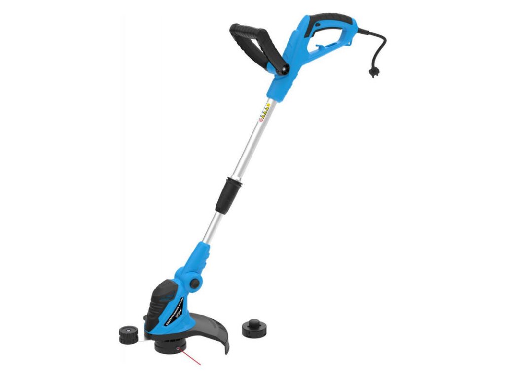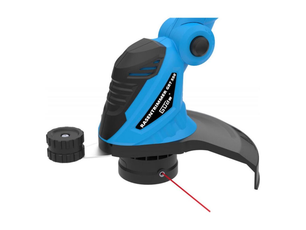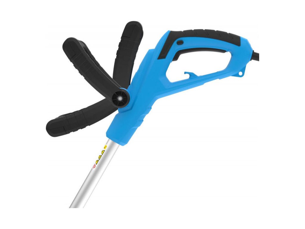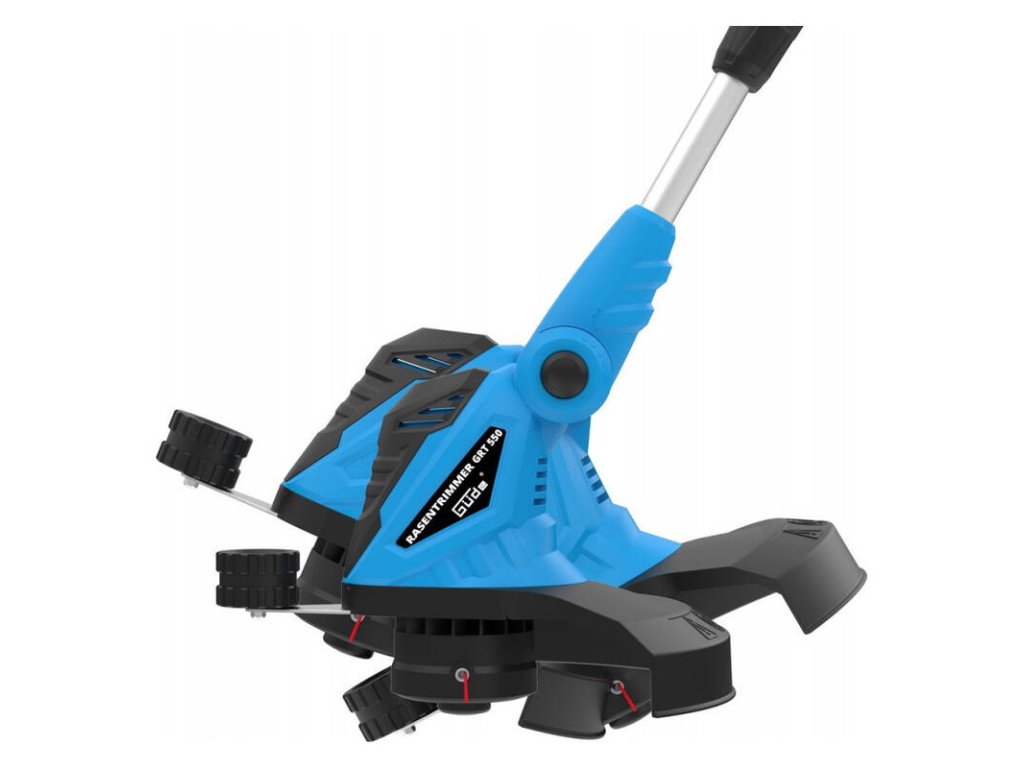 Strunová kosačka s ergonomicky tvarovanou mäkkou rukoväťou, 5-stupňovo nastaviteľná prídavná rukoväť, 5-smerná nakloniteľná rezacia hlava 180° otočná, vodiace koliesko na orezávanie hrán. Teleskopický výsuv pre optimálnu výšku uchopenia, 2-strunový systém s tlačidlovou nastavovacou automatikou, odľahčenie ťahu kábla.