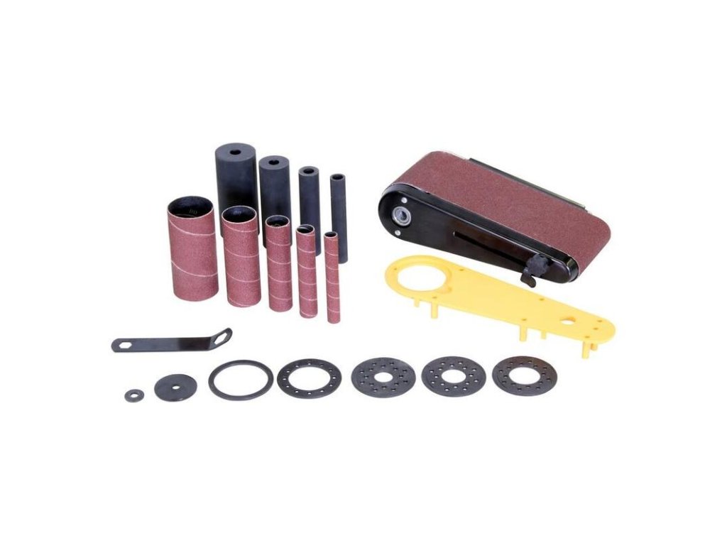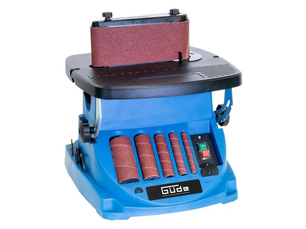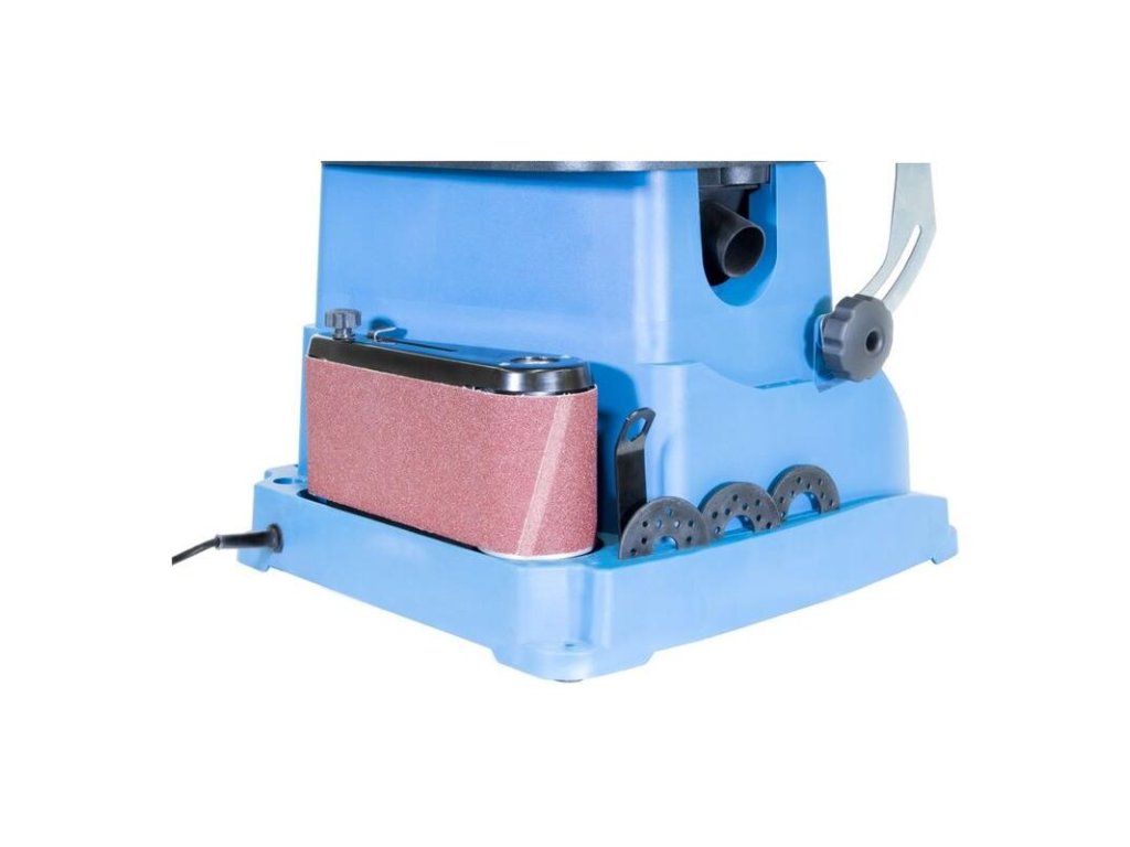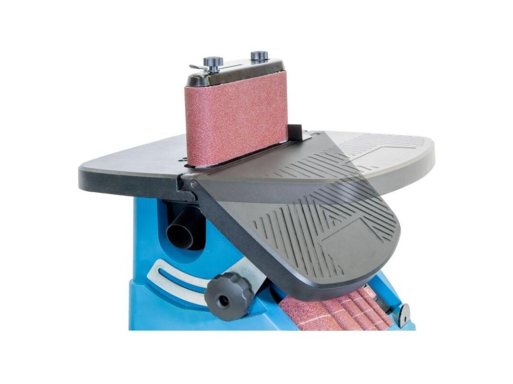 Vretenová a pásová brúska s osciláciou. Rýchle prestavenie bez náradia. Stôl prestaviteľný o 45°. Praktický priestor pre odkladanie príslušenstva a náradia. Vrátane 1 ks brúsneho papiera K80, 5 ks kladky: 2", 11/2", 1", 3/4", 1/2", 5 ks vložka do stola: 13, 19, 26, 38, 51 mm, 1 ks kladka pre brúsny pás, 1 ks kľúč.