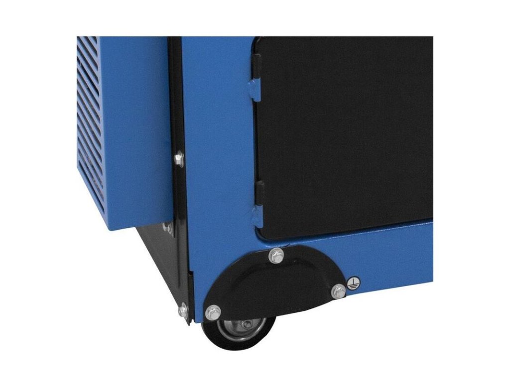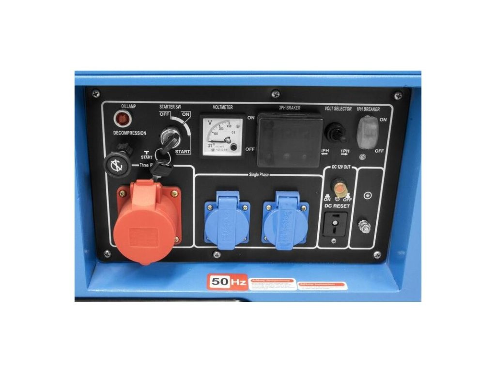 Naftový generátor SILENT, AVR (Automatická regulácia napätia pre stály výkon), 2 x Schuko zásuvka 230 V/50 Hz, 1 x CEE zásuvka 16 A/400 V/50 Hz, 1 x 12 V/8,3 A, nútené olejové mazanie, kolesá pre jednoduchší transport, voltmeter. Ochrana proti preťaženiu, elektroštartér pre batériu 12 V (batéria pre elektroštart nie je súčasťou balenia).