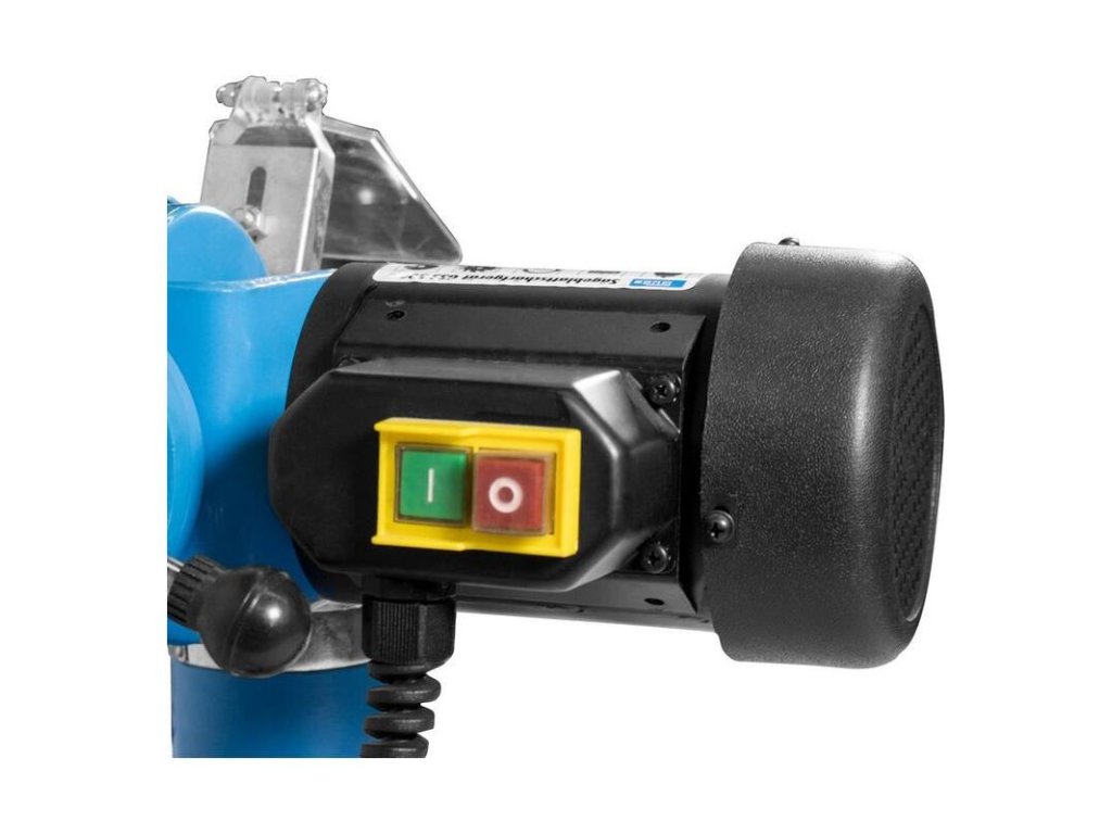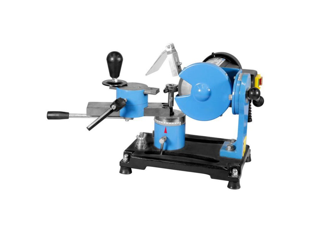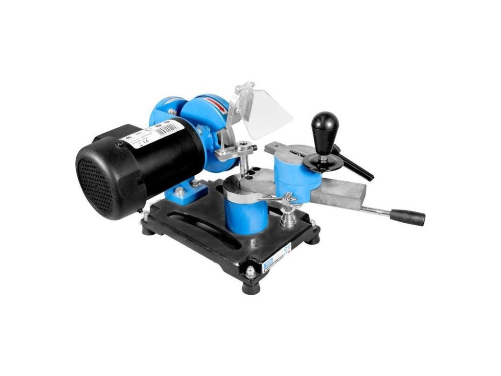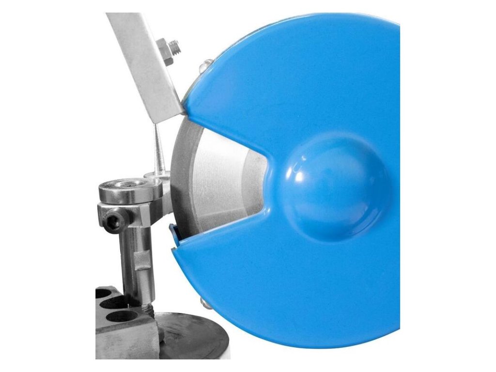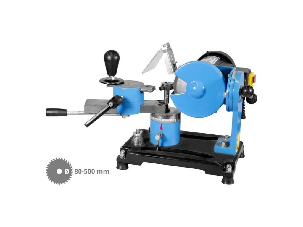 Brúska pílových kotúčov, určená na presné brúsenie/ostrenie všetkých bežne používaných typov kotúčov s vonkajším priemerom 80 - 500 mm (najmä ručných okružných/stolových kotúčových/kolískových píl a podobne) v podmienkach dielní a špecializovaných prevádzok (metóda suchého brúsenia). Brúsenie čela/chrbta pílových zubov vďaka kombinácii otočného upínacieho stola (30° vľavo - 80° vpravo v horizontálnej rovine)/polohovateľnej brúsnej hlavy (s nastaviteľným bočným vyklápaním +/- 30°), niekoľko otvorov pre fixáciu pílových kotúčov rôznych vonkajších priemerov, hĺbkový doraz brúsneho kotúča, oporná skrutka kotúča, podávacie sane pre presné navádzanie pílového kotúča pri ostrení. Motor 150 W, korpus ostričky z ocele, bočný kryt kotúča/priehľadná clona ako garancia bezpečnej práce s brúskou, vypínač v ochrannom puzdre, brúsny kotúč 125 x 30 x 10 mm, adaptéry pre rôzne vnútorné Ø kotúčov (7), základová časť s otvormi (4) pre montáž napevno.