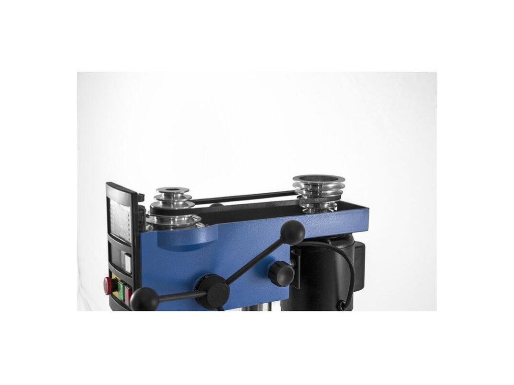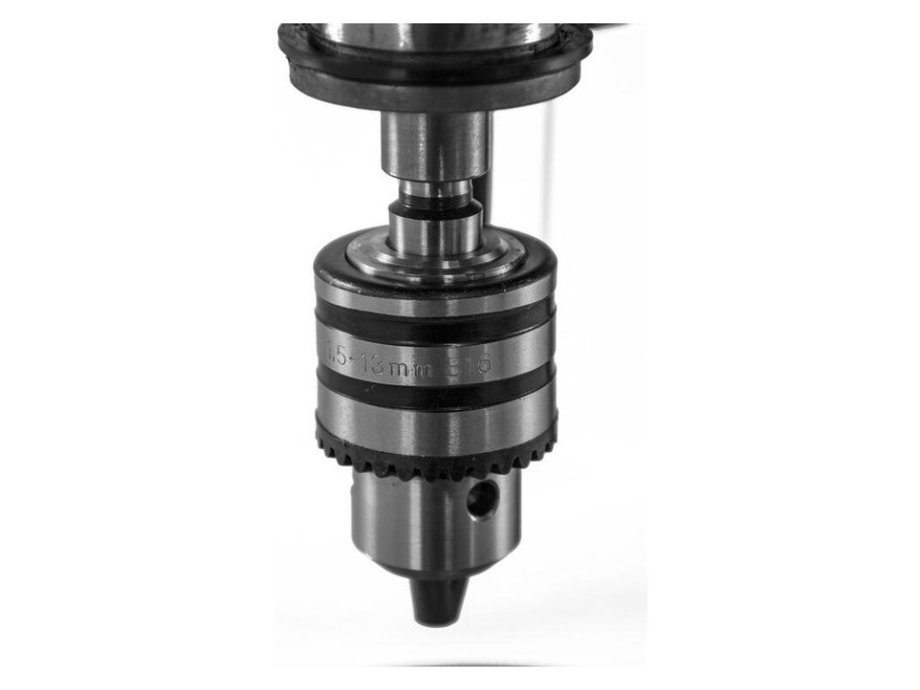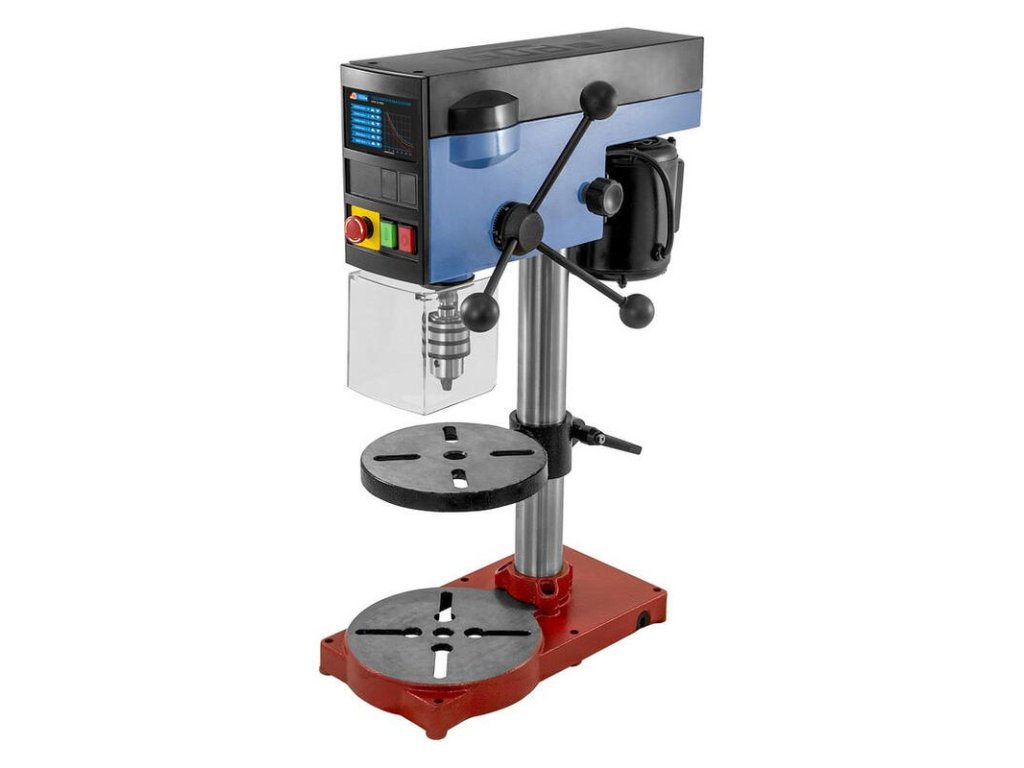 Stolová vŕtačka s pohonom klinovým remeňom, nastavenie rýchlosti pomocou stupňovitej remenice. Systém napínania klinového remeňa. Vŕtacie vreteno uložené v guľôčkových ložiskách. Vypínač so spínačom nulového napätia. Vysoká presnosť hádzania vretena (<0,02 mm). Sklápacia ochrana proti pilinám. Vŕtací stôl výškovo nastaviteľný, otočný o 360°. Nastaviteľný hĺbkový doraz vŕtania pre presné vŕtanie.