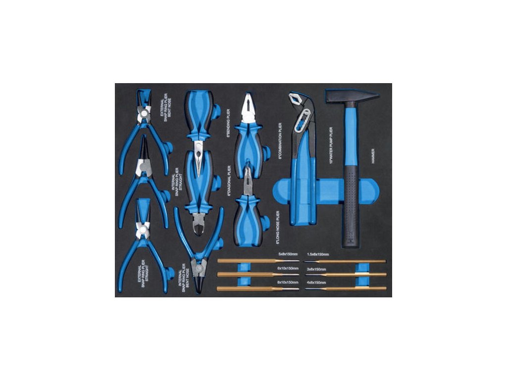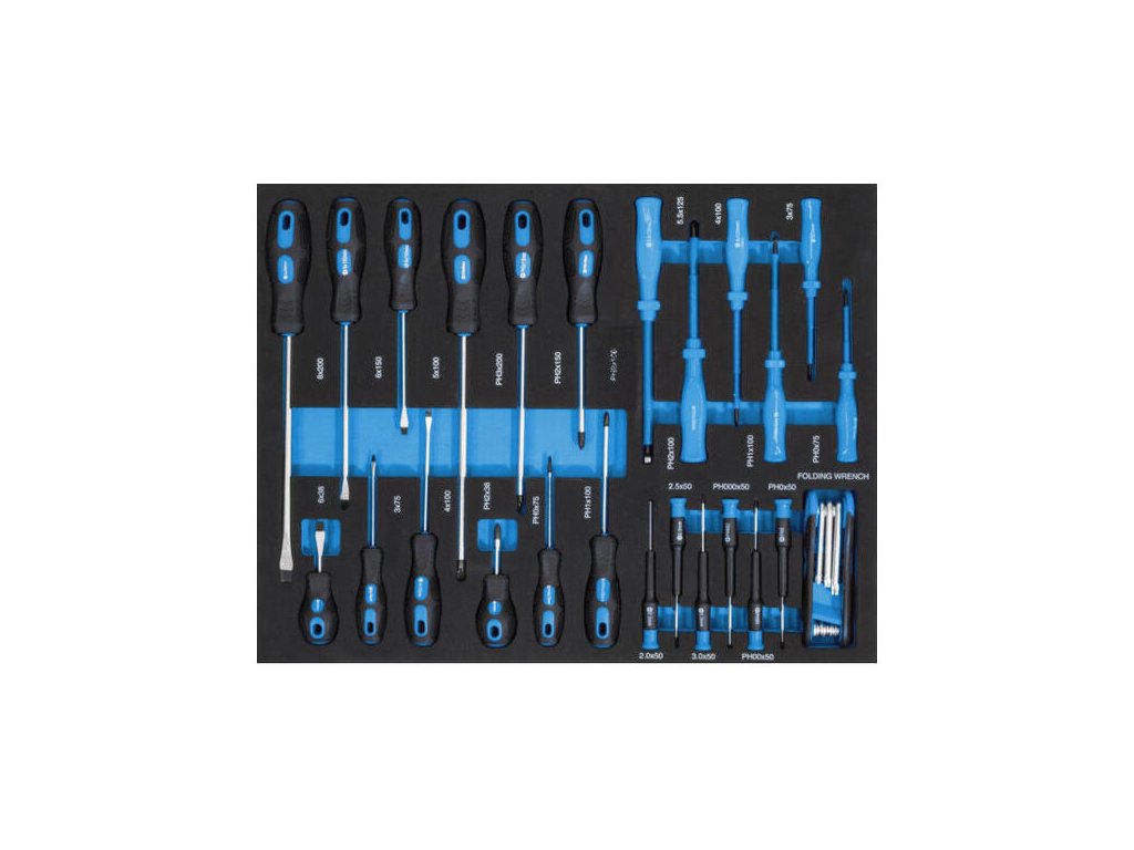 - 21 magnetických skrutkovačov s mäkkou rukoväťou: PHO/PH2x100, PH2x38, PH1x75, PH3x150, SL3/SL6x100, SL638, SL5x75, SL8x150, T6/T7/T8/T9/T10x75, T15/T20/T25/T27/T30x100, T40x150