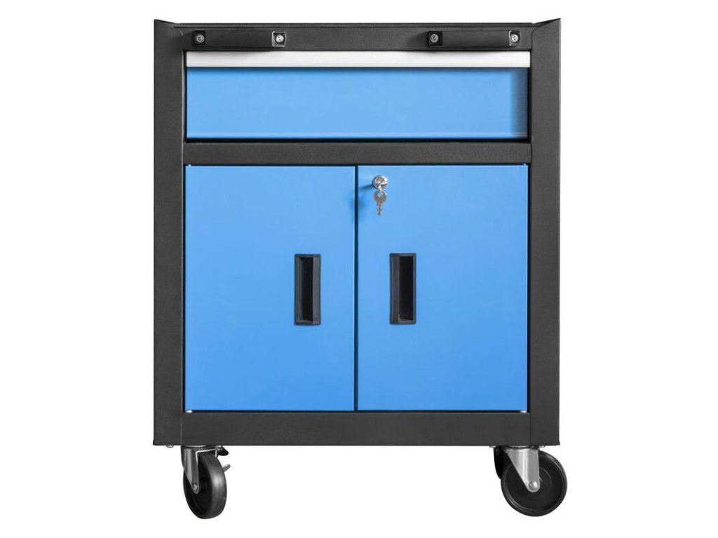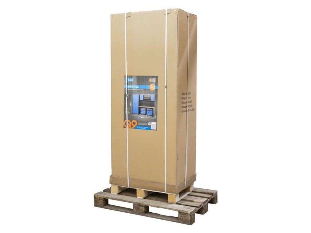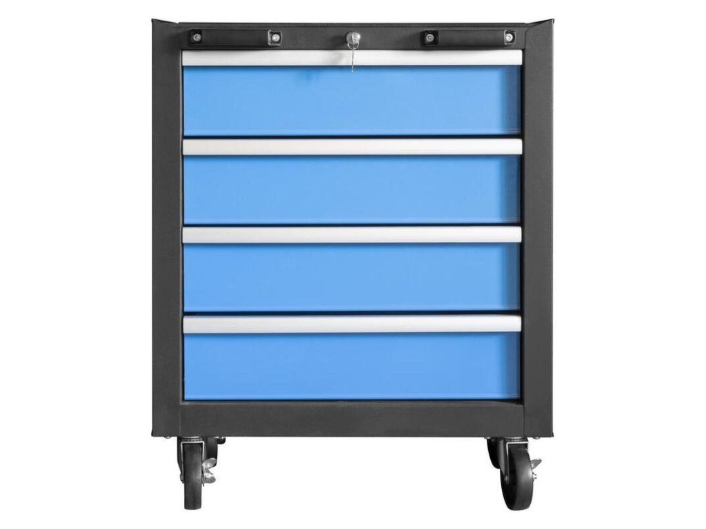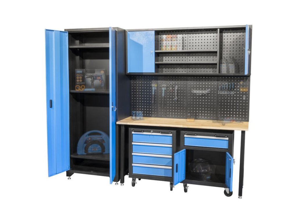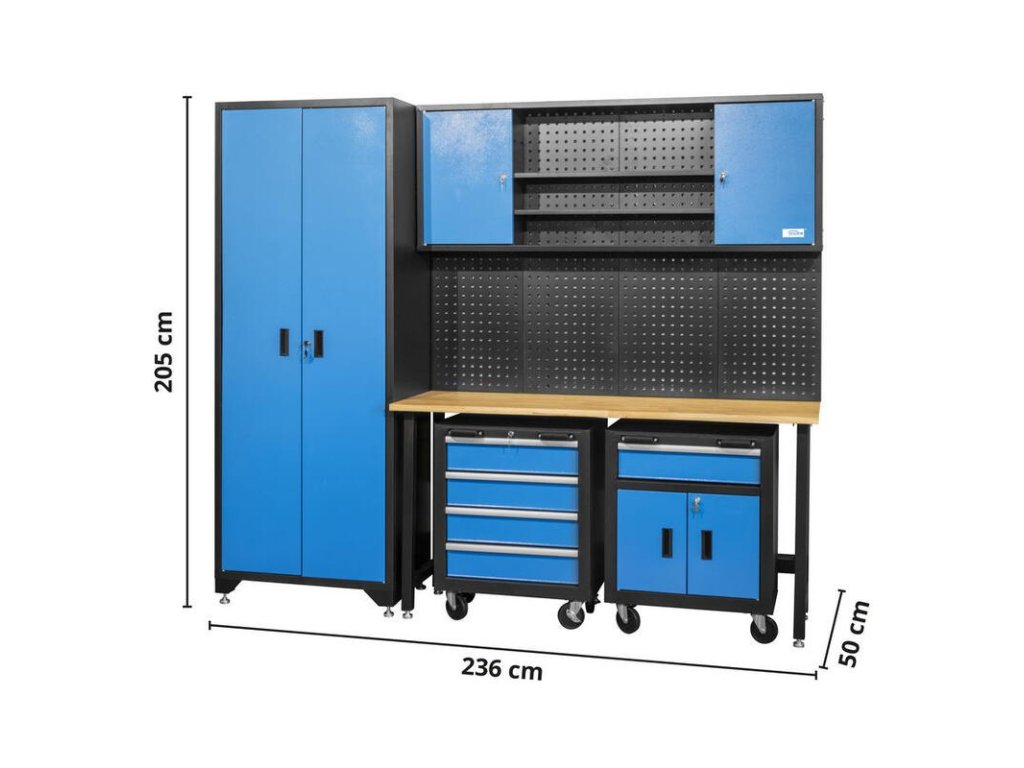 Súpravu tvorí 1 skriňa s 3 sklopnými policami, 2-dverová nástenná skrinka s perforovanou zadnou stenou, 1 perforovaná stena, 1 robustný pracovný stôl s drevenou doskou z gumovníka, 1 dielenský vozík so 4 zásuvkami, 1 dielenský vozík s 1 zásuvkou a 2 dvermi.