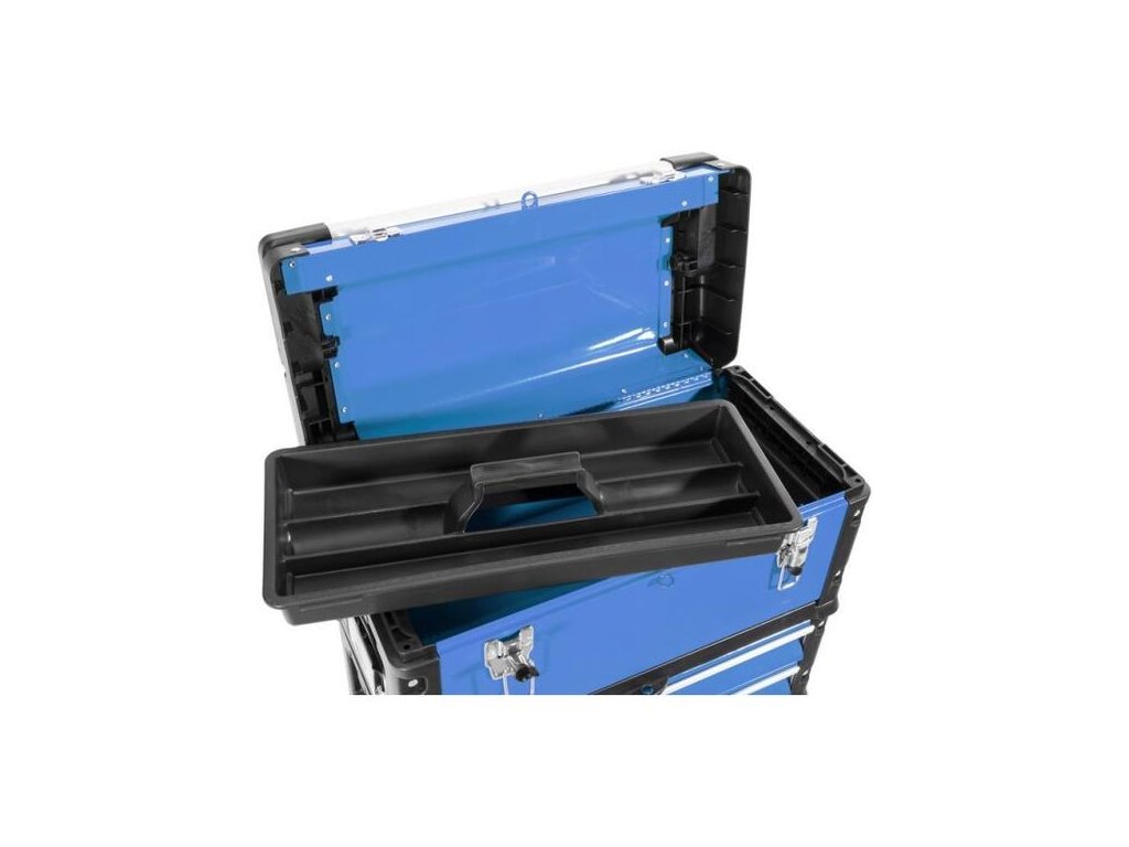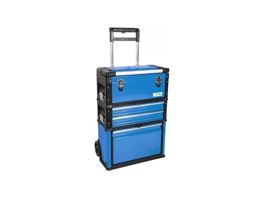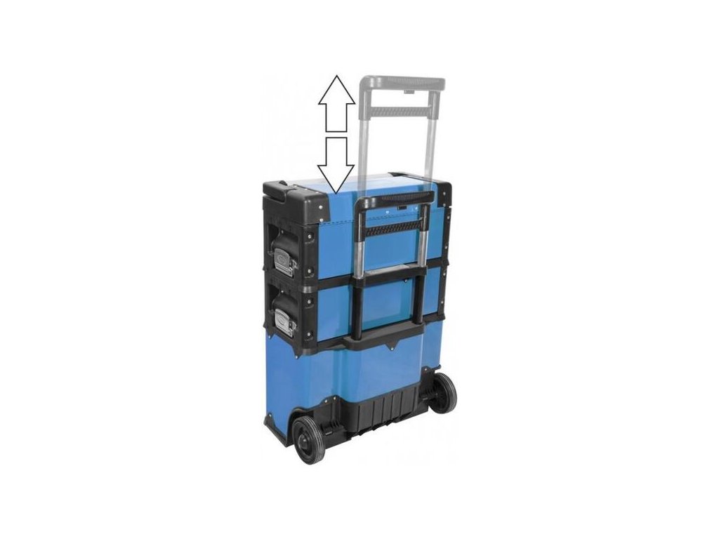 Trojdielny modulárny kufor na náradie. Odoberateľný kufrík na náradie s vložkou na malé súčiastky a náradie. Odoberateľný modul s dvoma zásuvkami (uloženými na guľôčkových ložiskách). Veľký vyklápací kontajner (vrátane vodiacich tyčí). Všetky tri moduly s držadlami na prenášanie, teleskopická rukoväť. Uzamykateľné visiacimi zámkami, konštrukcia z kovu a plastu, stabilné, veľké kolieska z tvrdenej gumy.