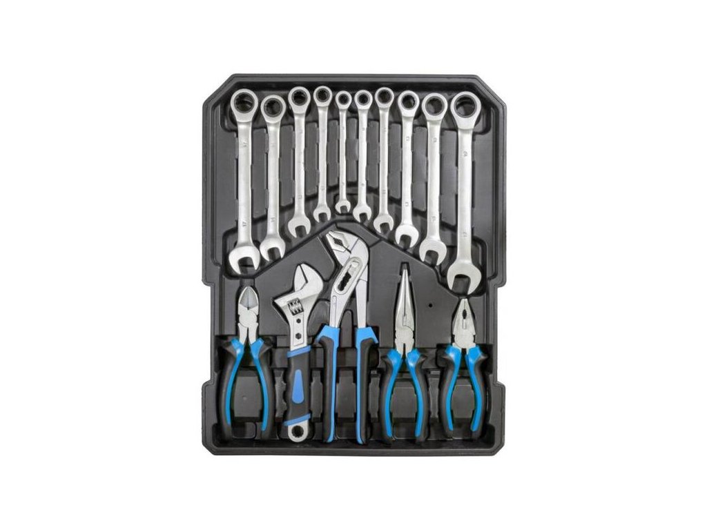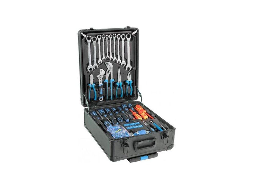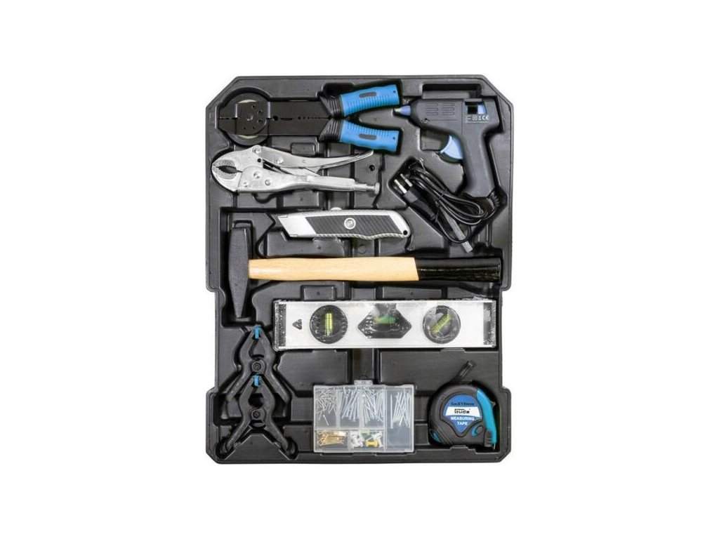 V sade sa nachádza základné náradie do každej domácnosti či dielne, upevňovacie svorky, kladivo 300 g, trapézový orezávací nôž, krimpovacie kliešte, univerzálne škripcové kliešte, meracie pásmo 5 m, termolepiaca pištoľ, vodováha, izolačná páska, káblové viazače, rôzne klince a skrutky.