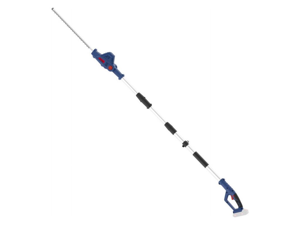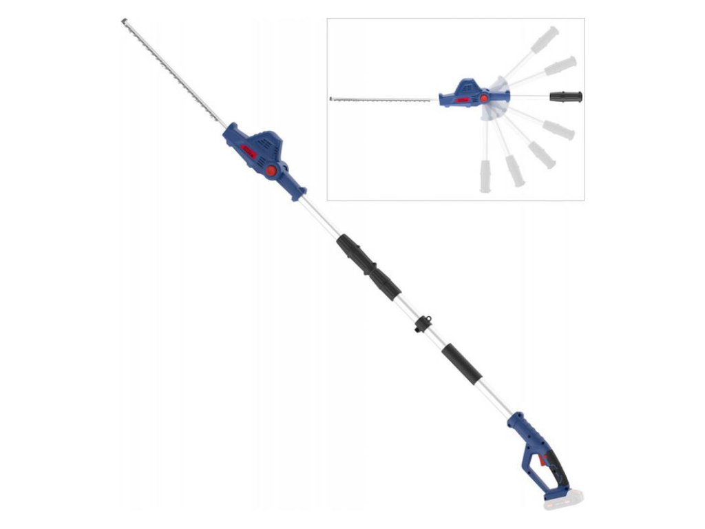 Akumulátorové nožnice na živý plot so systémom batérie 18V E³. Výklopná hlava motora o 90° (6 polôh), protibežné, laserom rezané a diamantom brúsené nože, rýchle zastavenie nožov, kovová prevodovka, teleskopická násada, mäkká rukoväť, prídavná rukoväť, ochrana lišty, ramenný popruh. Bez batérie a nabíjačky.